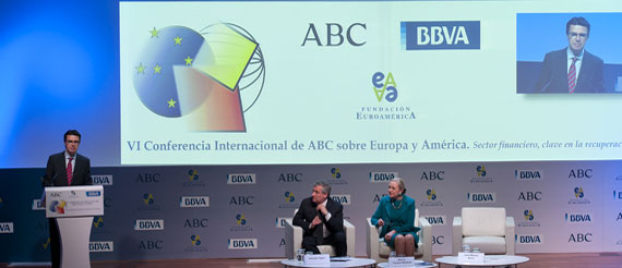 Con el objetivo de dar respuesta a los nuevos retos que plantean los tiempos actuales, tan cambiantes como inciertos, se ha celebrado en Madrid la VI Conferencia Internacional de ABC sobre Europa y América, cuyo eje fundamental este año ha sido el papel del sector financiero en la recuperación económica. Las palabras de Francisco González, presidente del BBVA, inauguraron un foro que durante dos días se convirtió en un instrumento al servicio del desarrollo financiero y social. En su intervención, González defendió las medidas puestas en marcha por el Gobierno español, a pesar de tratarse de recortes “impopulares” y de los “costes sociales” que acarrean, convencido de su necesidad para “recuperar la credibilidad perdida”, al tiempo que abogaba por un plan sólido y un modelo económico basado en “la innovación, el emprendimiento y la educación”. Para ello –defendió– es necesario que la Unión Europea se solidarice y apoye a los estados que están tomando medidas como el español, pues “tenemos una oportunidad única para lograr una Europa más competitiva, próspera y cohesionada”. Y eso, según González, “exige sacrificios a corto plazo”.