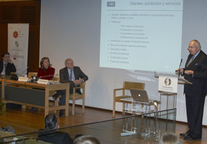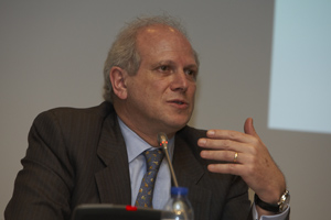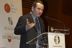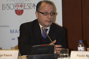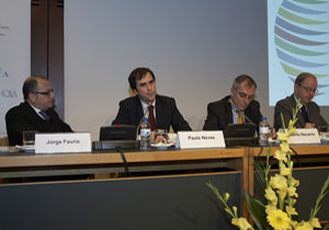 | Alexandre Almeida, ANETIE (Associação Nacional das Empresas Tecnologias de Informação e Electrónica); Margarida Marques, Directora de la Representación Comisión Europea, Portugal; Carlos Malamud, Investigador principal para América Latina del Real Instituto Elcano, y Germán Jaramillo, Representante de la Corporación Andina de Fomento, CAF [en atril] |