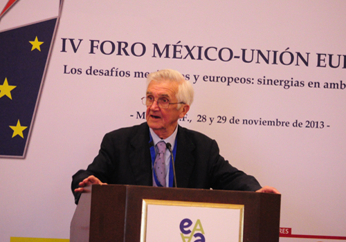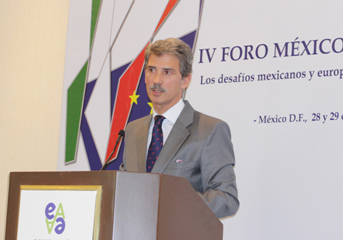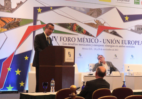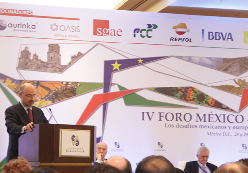 Ceremonia de apertura: En el atril, Carlos de Icaza, Subsecretario de Relaciones Exteriores, México. Al fondo, Stephan Vavrik, Encargado de Negocios de la Delegación de la Unión Europea en México, y Lord Garel-Jones, Ex Ministro de Asuntos Exteriores Europeos y de América Latina del Reino Unido y Presidente de Honor de la Fundación Euroamérica |