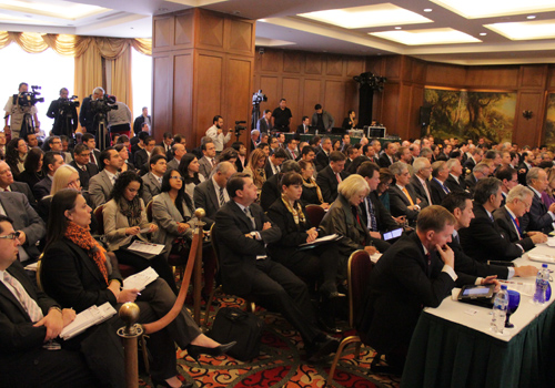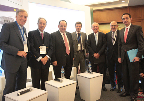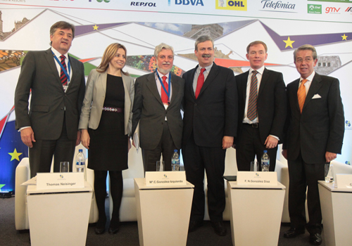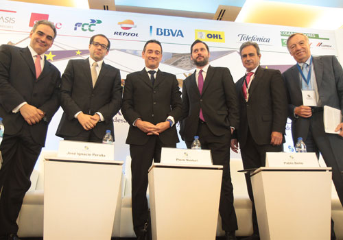 Segunda jornada, primera sesión: Carsten Moser, Vicepresidente de la Fundación Euroamérica; Juan Miguel Villar Mir, Presidente Grupo OHL; Raúl Murrieta, Subsecretario de Infraestructuras, México; Rafael Catalá, Secretario de Estado de Infraestructuras, Transporte y Vivienda, España; Luis Zárate, Presidente de la Cámara Mexicana de la industria de la Construcción, CMIC; Juan Béjar, Vicepresidente y Consejero Delegado, FCC, y Juan Castro, Vicepresidente de Concretos e Infraestructuras, CEMEX-México |