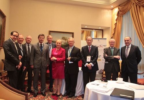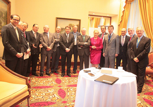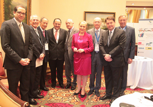 Benita Ferrero-Waldner, presidenta de la Fundación Euroamérica, y un grupo de ponentes, en una reunión en la sala VIP |