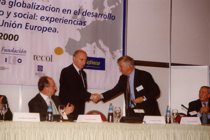 | Rodrigo Rato, Vicepresidente del Gobierno para Asuntos Económicos y Ministro de Economía, España; Fernando de la Rúa, Presidente de la Nación, Argentina; Tristan Garel-Jones, Presidente de la Fundación Euroamérica y ex Ministro de Estado para Asuntos Europeos del Reino Unido y Carlos Solchaga, ex Ministro de Economía y Hacienda de España y Vicepresidente de la Fundación Euroamérica |