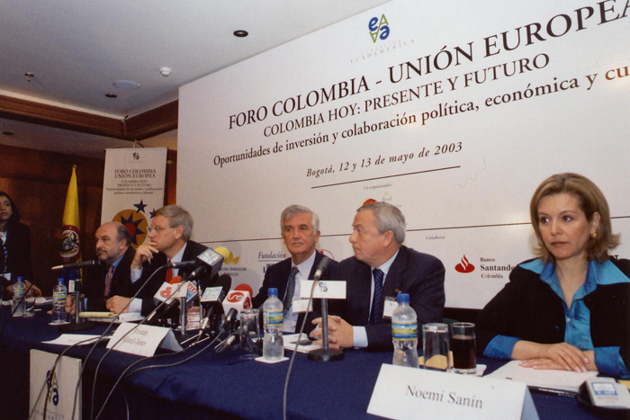 | Joaquín Almunia, ex Ministro de Trabajo, España; Carl Bildt, ex Primer Ministro de Suecia; Tristan Garel-Jones, Presidente de la Fundación Euroamérica; Carlos Solchaga, ex Ministro de Hacienda, España, y Noemí Sanín, Embajadora de Colombia en España. |