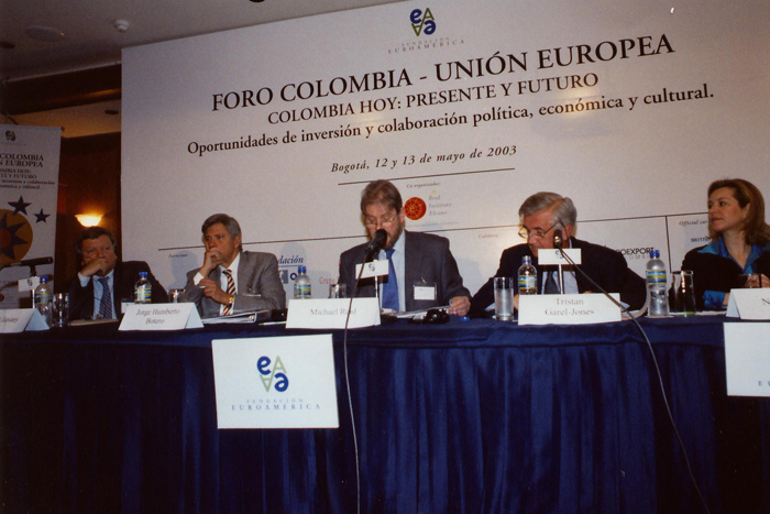 | Jean Glavany, ex Ministro de Agricultura de Francia; Jorge Humberto Botero, Ministro de Comercio de Colombia; Michael Reid, The Economist, Reino Unido; Tristan Garel-Jones, ex Ministro de Asuntos Europeos, Reino Unido, y Noemí Sanín, Embajadora de Colombia en España. |
