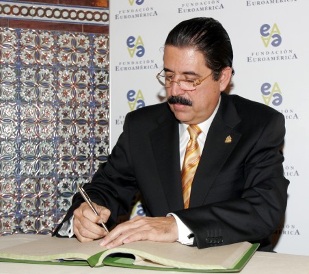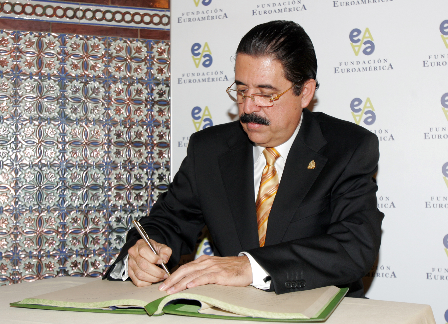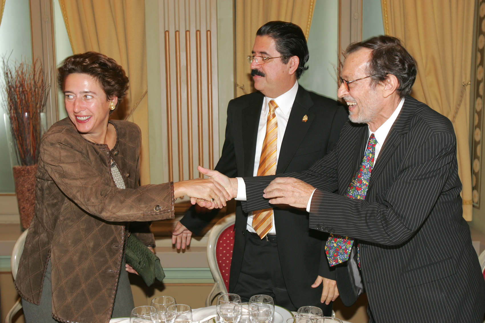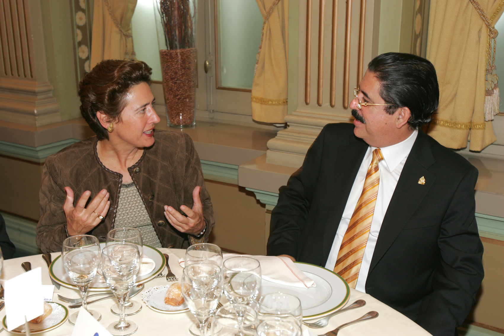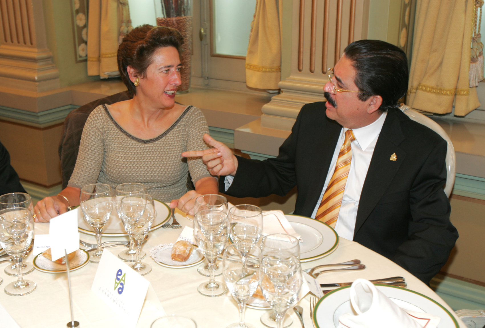 | Nuevas oportunidades de inversión y desarrollo en Honduras Dentro de su visita oficial a España, invitado por Sus Majestades los Reyes en diciembre de 2006, el Presidente de Honduras,Manuel Zelaya, incluyó en su programa una cena-coloquio con la Fundación Euroamérica a la que asistieron unas cuarenta personalidades de la diplomacia, las instituciones y las empresas. El presidente Zelaya, del Partido Liberal, que asumió sus funciones en enero de 2006, presentó las líneas de actuación de su gobierno, basadas fundamentalmente en la transparencia, la seguridad jurídica y la lucha contra la pobreza, lo que puede estimular las posibilidades de inversión extranjera en el país centroamericano. Acompañaron al presidente hondureño los ministros de Relaciones Exteriores, Milton Jiménez; del despacho presidencial, Yani Rosenthal y su secretario privado, Raúl Valladares. |