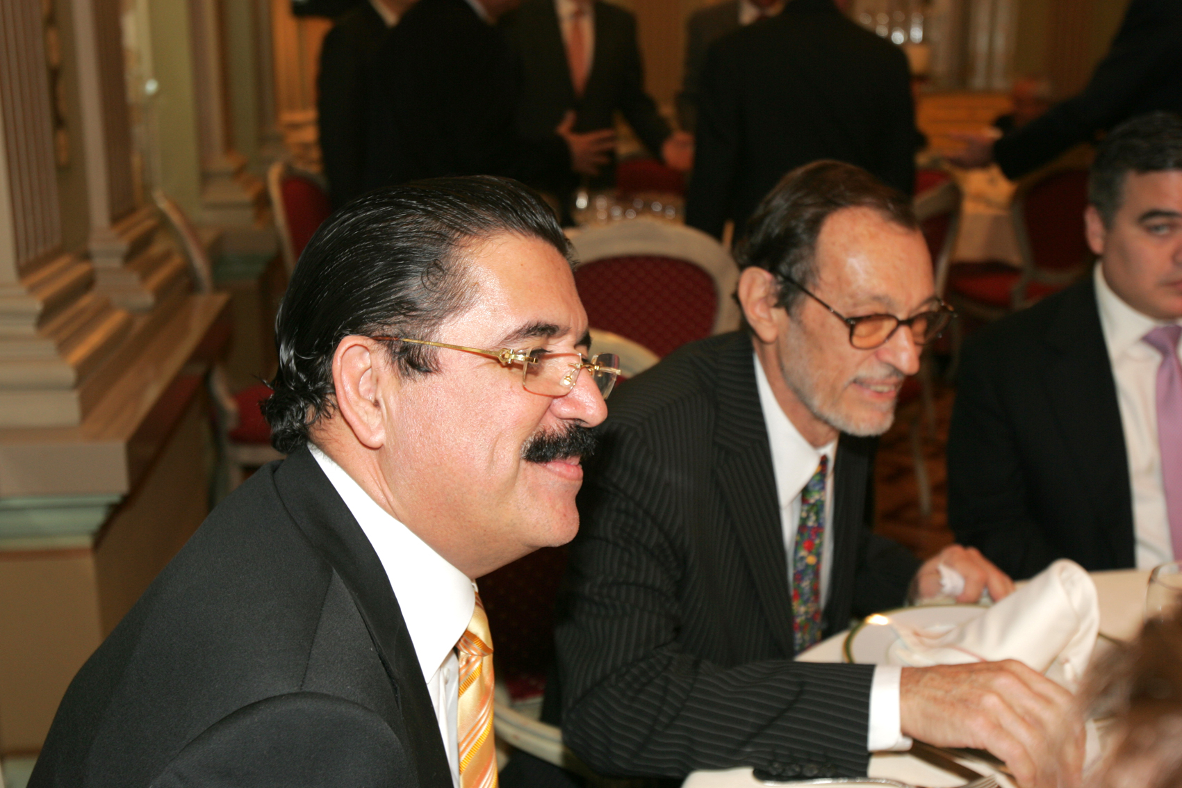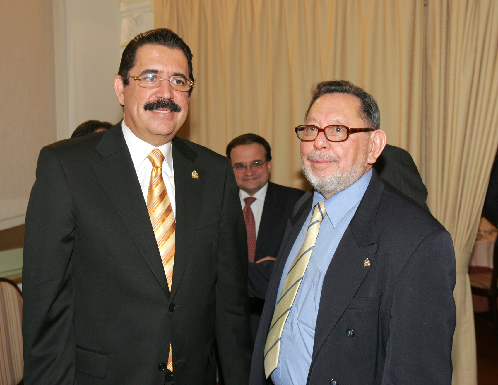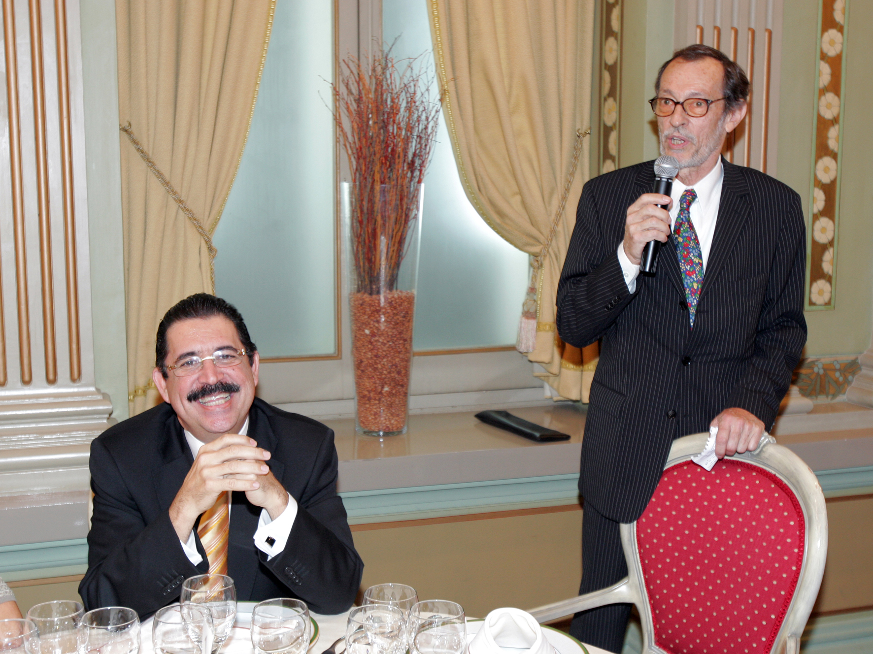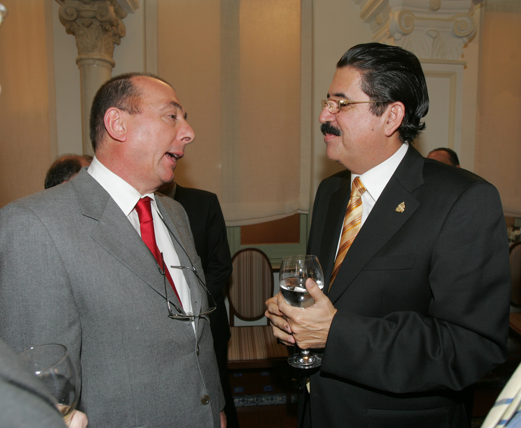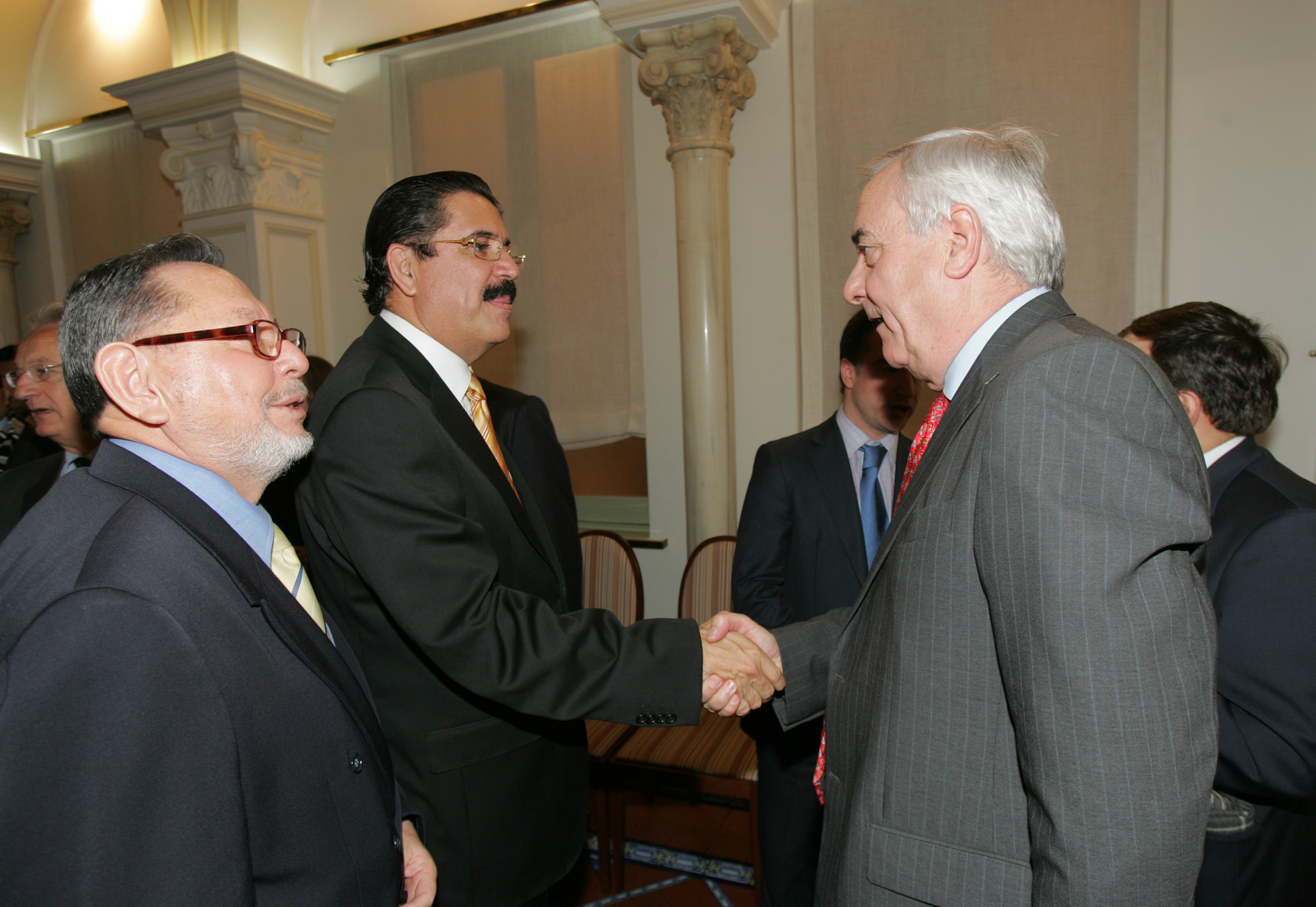 | Nuevas oportunidades de inversión y desarrollo en Honduras Dentro de su visita oficial a España, invitado por Sus Majestades los Reyes en diciembre de 2006, el Presidente de Honduras,Manuel Zelaya, incluyó en su programa una cena-coloquio con la Fundación Euroamérica a la que asistieron unas cuarenta personalidades de la diplomacia, las instituciones y las empresas. El presidente Zelaya, del Partido Liberal, que asumió sus funciones en enero de 2006, presentó las líneas de actuación de su gobierno, basadas fundamentalmente en la transparencia, la seguridad jurídica y la lucha contra la pobreza, lo que puede estimular las posibilidades de inversión extranjera en el país centroamericano. Acompañaron al presidente hondureño los ministros de Relaciones Exteriores, Milton Jiménez; del despacho presidencial, Yani Rosenthal y su secretario privado, Raúl Valladares. |