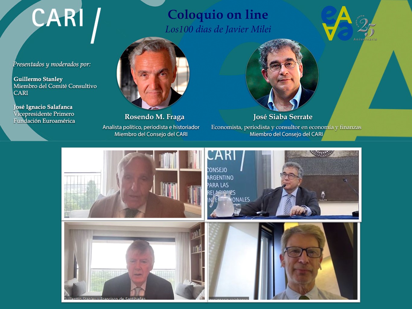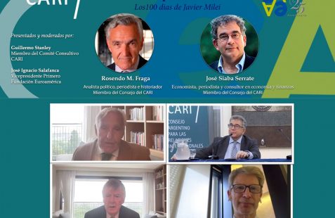 Como resultado de la firma de un acuerdo entre CARI y la Fundación Euroamérica, se celebró este primer encuentro online para analizar la situación en Argentina tras los primeros 100 días de gobierno del presidente Javier Milei. Para ello, se contó con dos analistas de primer nivel: para la parte política, Rosendo Fraga y para contrastar la parte económica, José Siaba Serrate. Durante una hora, y en un estricto Chatham House Rule, se desarrolló un coloquio entre ambos expertos, moderados por Guillermo Stanley, al que siguió un coloquio con los asistentes al acto, moderado por J. Ignacio Salafranca.