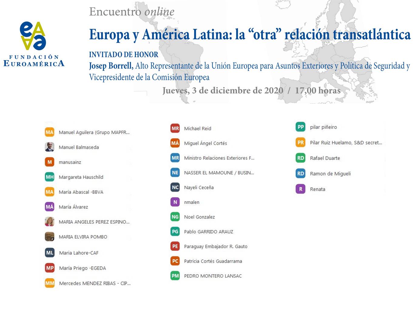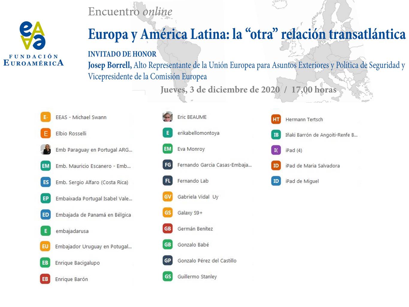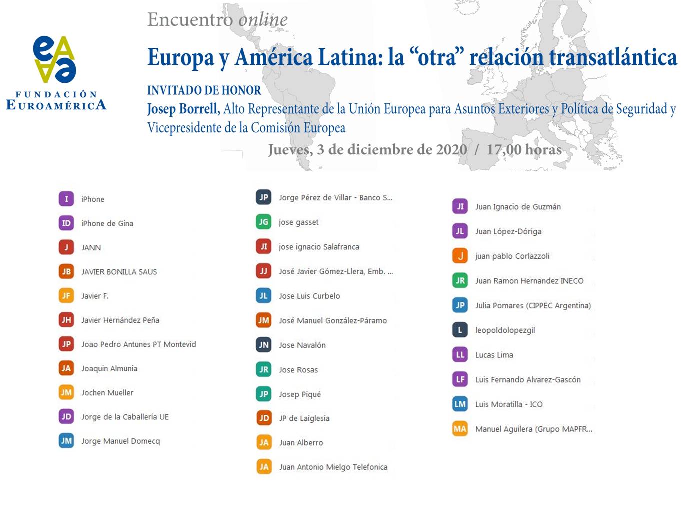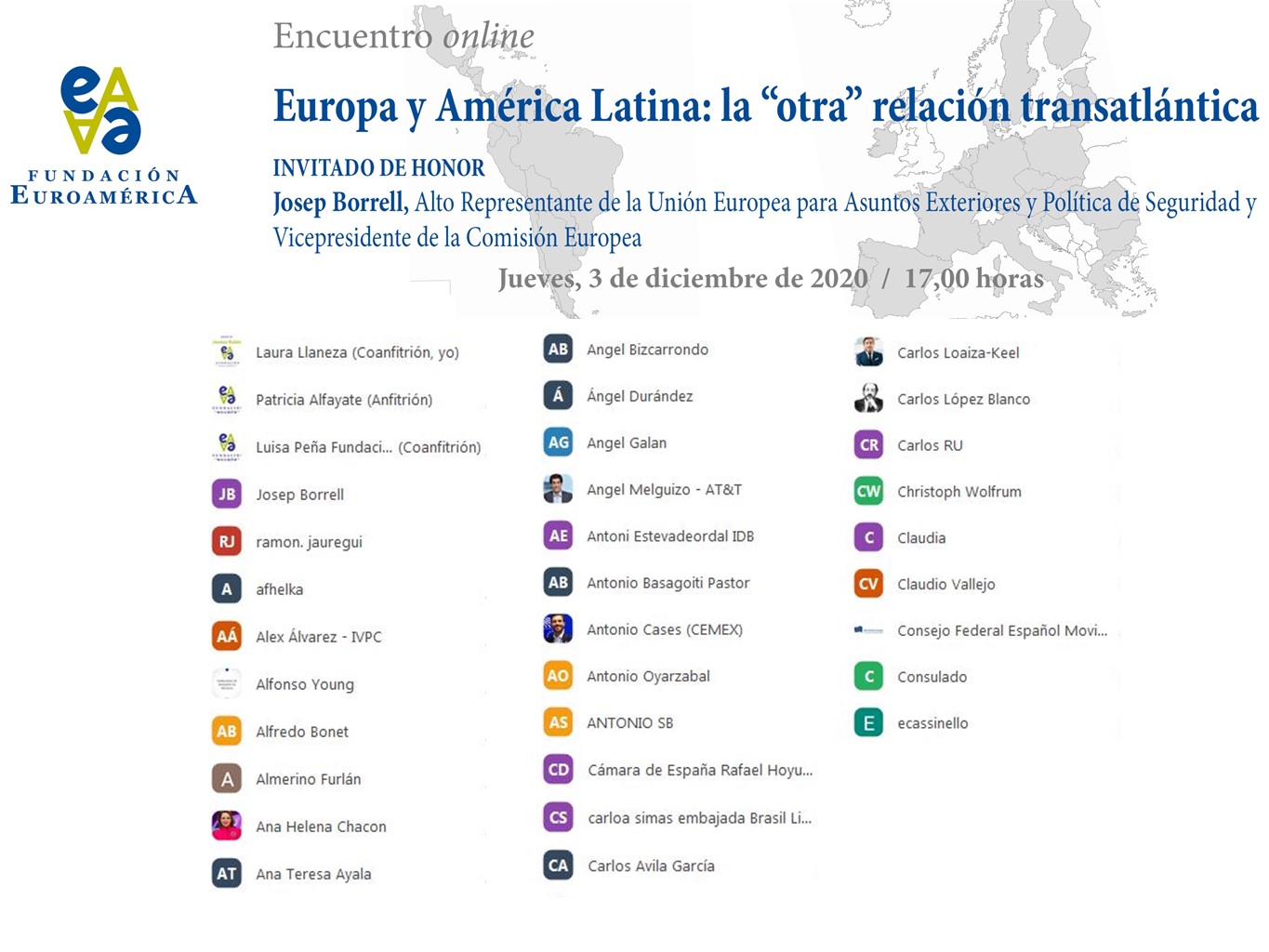Recuerda el Alto Representante la importancia de las inversiones europeas en America latina “ Cuando hablamos de la relación trasatlántica parece que América Latina no estuviera también del otro lado del Atlántico; la relación trasatlántica es, por antonomasia, la del Atlántico norte; nadie habla de la otra relación trasatlántica, la del Atlántico sur pero habría que incluirla en esta perspectiva trasatlántica”. Europa no es consciente de que las empresas europeas han invertido en América Latina más que en Rusia, India, China y Japón juntos. Nos unen además muchos lazos que hay que poner de relieve: El histórico primero: hay una historia enorme compartida en el siglo XVI pero no por todos los países europeos. Políticamente somos socios con el G20, con México, Brasil y Argentina tenemos prioridades coincidentes, el Acuerdo de París contra el cambio climático, la Agenda 2030; institucionalmente es difícil encontrar otra región del mundo con la que tengamos tantos lazos institucionales, diplomáticamente, por ejemplo si sumamos nuestros votos y los de ALC, somos un tercio de los votos en Naciones Unidas. Desde el punto de vista comercial cita los acuerdos suscritos con 27 de los 33 países. Somos el principal inversor en la región y el tercer socio comercial. Culturalmente, compartimos idiomas y un marco similar de referencias culturales. En resumen, somos los pueblos más afines del mundo y a pesar de ello, nuestra relación está muy por debajo de su potencial; Europa no le da a América Latina su importancia estratégica y hay que corregirlo.