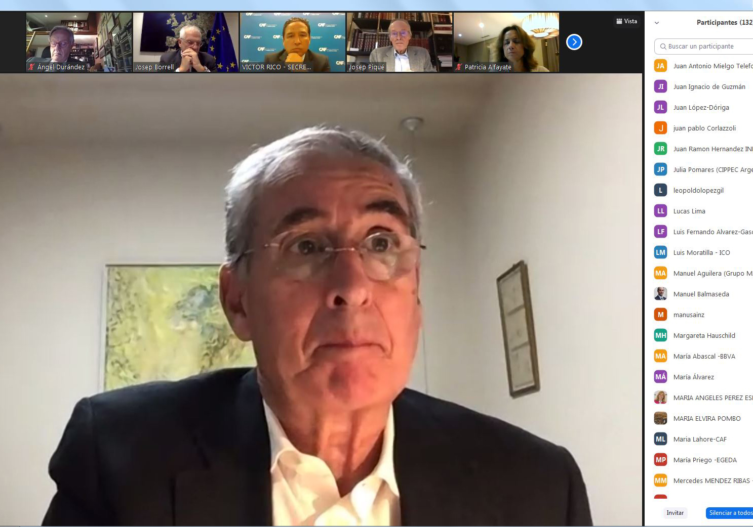 Interviene a continuación Josep Piqué, presidente de la Fundación Iberoamericana Empresarial, coimpulsor del documento América Latina: Una agenda para la reconstrucción quien destaca la satisfacción de FIE por haber colaborado en el informe que define como pragmático y que contiene además recomendaciones precisas y expresa el deseo de darle continuidad, concreción y contenido a las medidas empujando hacia las diferentes instituciones, tanto en Europa como en América Latina para que, efectivamente, entre todos avancemos en la dirección correcta.