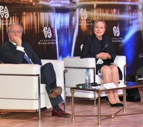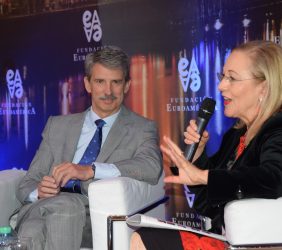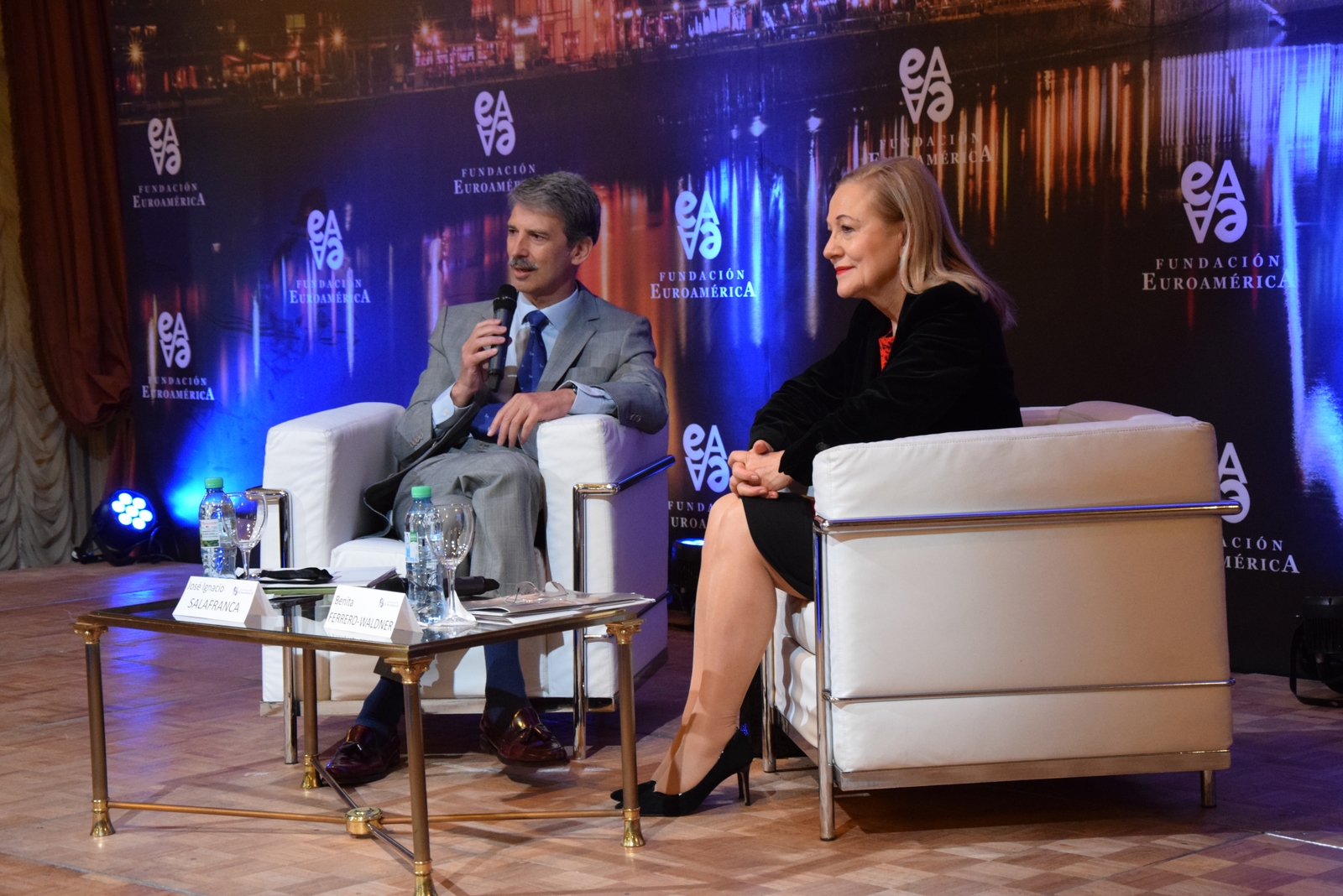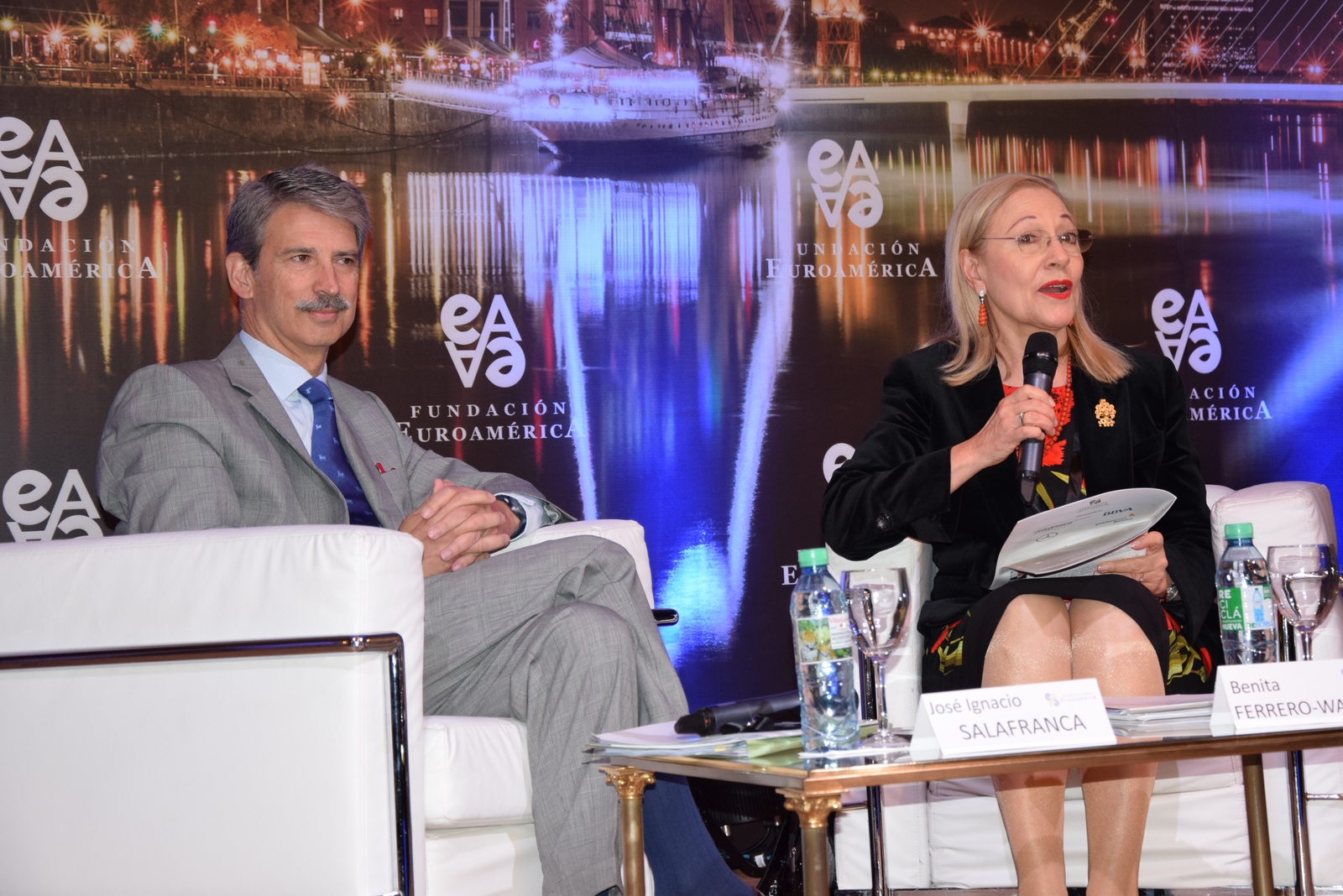 Benita FERRERO-WALDNER, Presidenta de la Fundación Euroamérica: Inicia sus palabras con una breve introducción al Sr. Salafranca, destacando sus cargos relacionados con América Latina como eurodiputado y Presidente de la Asamblea Parlamentaria Eurolat, Presidente de la Comisión de Observadores electorales, habiendo ejercido de observador en varios procesos electorales en momentos delicados como en México o Líbano. Hasta hace pocos meses ha sido el Embajador –jefe de la Delegación de la Unión Europea en Buenos Aires y ahora, entre sus funciones como europarlamentario, está la de ejercer como ponente en el Acuerdo UE-Mercosur. Todo esto le convierte en un invitado especial en este Foro, en el que hablará entre otros temas de la actual situación de las negociaciones del Acuerdo entre estas dos regiones del mundo. Precisamente la Sra. Ferrero-Waldner asistió en el año 1996, entonces como Secretaria de Estado de Asuntos Exteriores de su país, Austria, en Brasil para defender de forma muy entusiasta este Acuerdo.