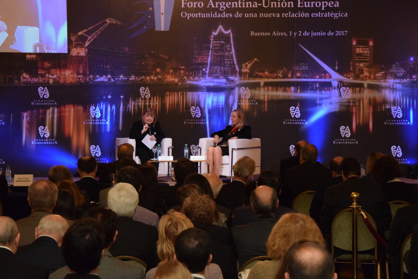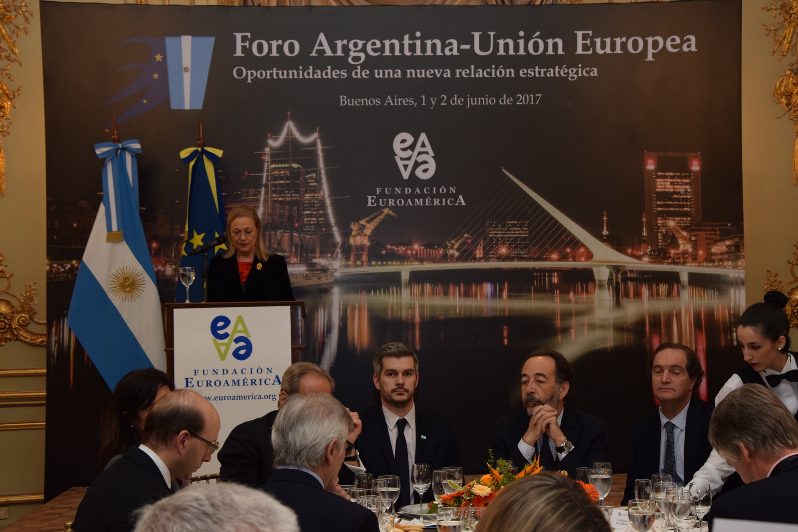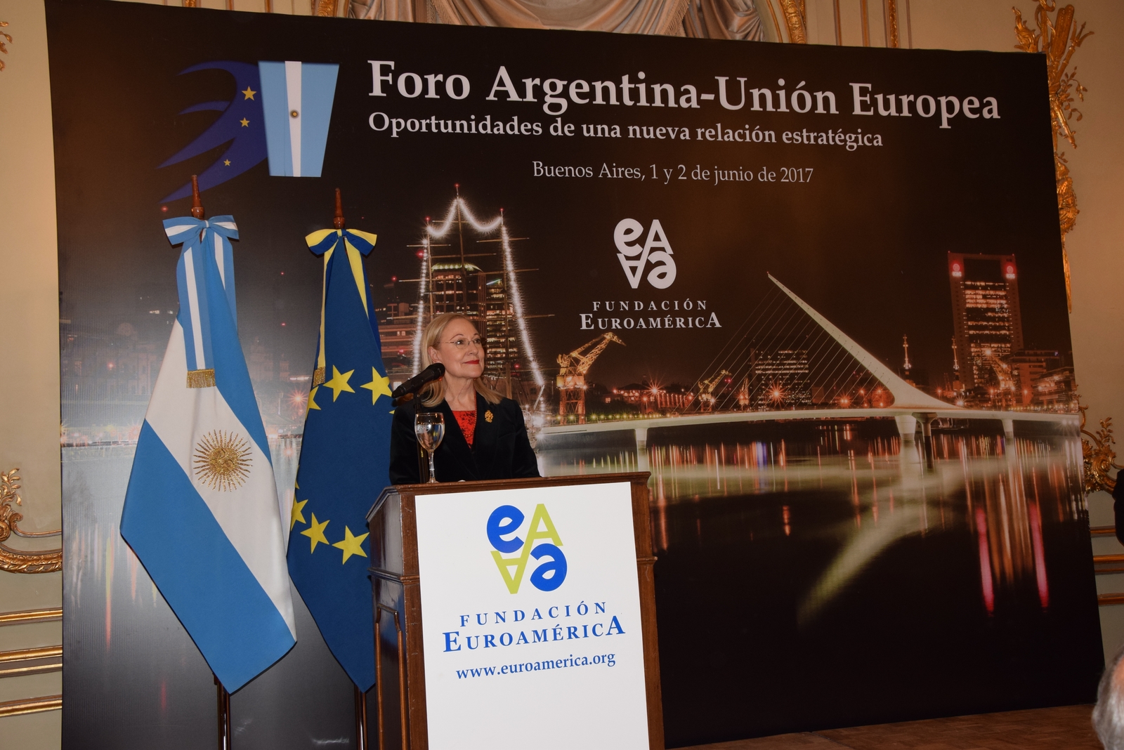 Durante su intervención destacó el papel de los países europeos y de la UE resaltando que lo primero que plantean tanto el Presidente Macri como la Canciller Malcorra en sus recientes y numerosas visitas a Europa es la necesidad de avanzar en el Acuerdo UE-Mercosur porque “ésta es una decisión política muy profunda entre dos pueblos que comparten valores, tradiciones y sangre. Y en un mundo dinámico, complejo y desafiante fortalecer esa relación es vital no sólo por la integración económica, y lo que eso puede generar, sino por lo valores que nos unen y que tenemos que defender en conjunto: democracia, una economía integrada y global, los derechos humanos y todos los valores culturales que nos acompañan. La Argentina ha asumido un papel protagónico siempre de la mano de la región. No es casualidad que el primer país que visitó el Presidente Macri fue Brasil y Chile con un mensaje de integración.”