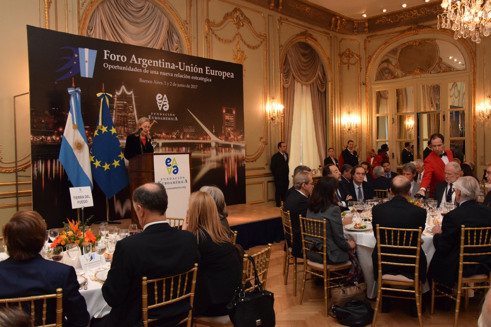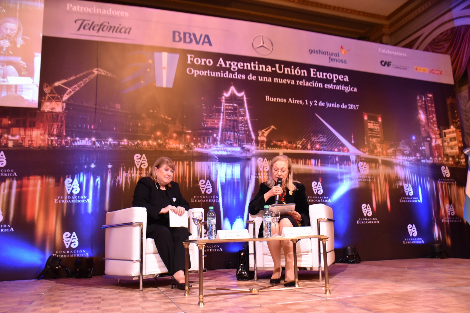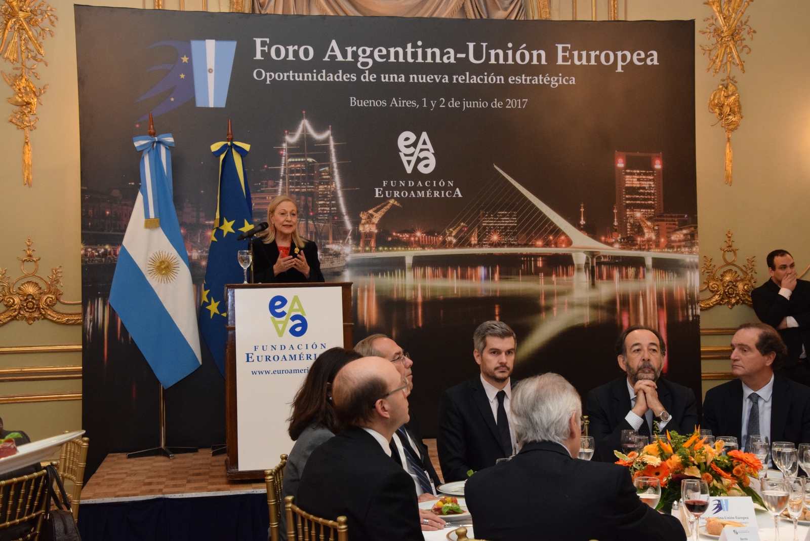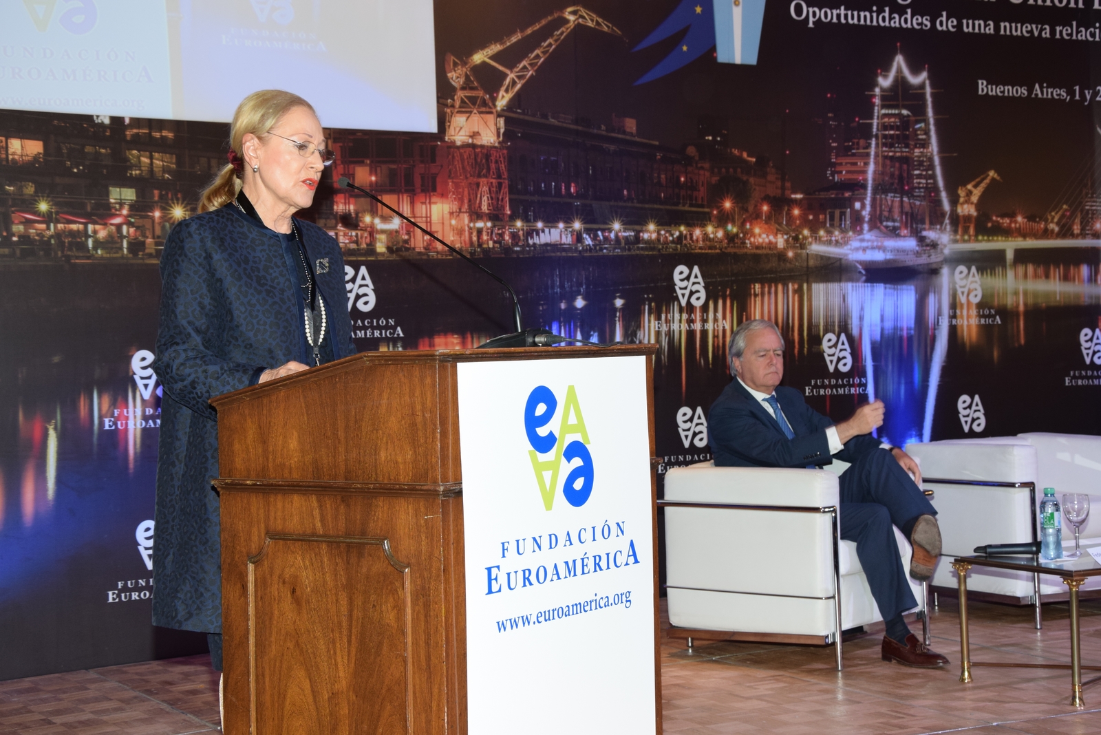 Durante su intervención destacó el papel de los países europeos y de la UE resaltando que lo primero que plantean tanto el Presidente Macri como la Canciller Malcorra en sus recientes y numerosas visitas a Europa es la necesidad de avanzar en el Acuerdo UE-Mercosur porque “ésta es una decisión política muy profunda entre dos pueblos que comparten valores, tradiciones y sangre. Y en un mundo dinámico, complejo y desafiante fortalecer esa relación es vital no sólo por la integración económica, y lo que eso puede generar, sino por lo valores que nos unen y que tenemos que defender en conjunto: democracia, una economía integrada y global, los derechos humanos y todos los valores culturales que nos acompañan. La Argentina ha asumido un papel protagónico siempre de la mano de la región. No es casualidad que el primer país que visitó el Presidente Macri fue Brasil y Chile con un mensaje de integración.”