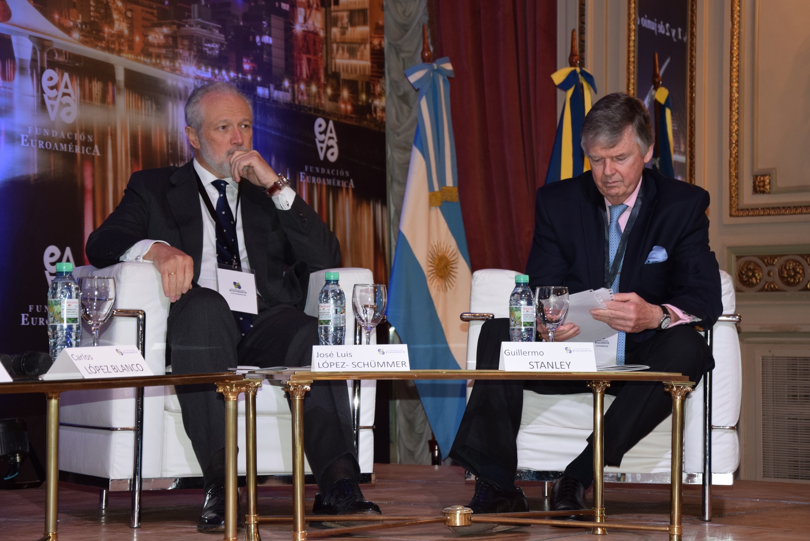 Guillermo Stanley da paso a un coloquio en el que Carlos López Blanco pone de manifiesto cómo en épocas de dificultad, como la crisis de España de los años pasados, se puede avanzar si se dan los pasos necesarios. Así se hizo en el sector de automoción (como se ha comentado anteriormente), en las infraestructuras de fibra óptica (poco desarrollada entonces en España convirtiéndola en el primer país europeo y el cuarto del mundo en despliegue de fibra óptica). Los momentos de dificultad también son momentos de grandes avances y también Argentina puede avanzar en estos momentos de reformas. El Ministro Cabrera recalca que en Argentina la macro-política va a liderar la micro-política y encauzando las cosas para dar seguridad a las inversiones. Respecto del sector energético, Guillermo Stanley comenta que Argentina está mirando a España debido a su experiencia. El incremento de demanda de energía en el mundo, hará que se apueste, sin que desaparezcan las otras fuentes, por las fuentes renovables y el gas. Argentina es una gran potencia en gas por sus grandes reservas y en renovables por la condiciones de su territorio, tanto en solar como en eólico, comentó el Sr. Aranda. El Sr. López Schümmer indicó que la logística, para el sector automotriz, es fundamental ya que supone un 15% del coste del automóvil pero para ser competitivo, dijo, hay que enfocar todos los puntos como salarios, innovación y aranceles, siendo conveniente una ventanilla única del sector para evitar tener muchos interlocutores, como todavía sucede en España. A la pregunta del Sr. Stanley sobre si se ve más pragmatismo en los sindicatos, se recuerda que en España con motivo de la crisis, el que se aceptara el convenio de empresas fue un ejemplo de pragmatismo. Pero Carlos López Blanco, en una reflexión más general, opinó que habiendo dado los sindicatos un ejemplo de pragmatismo, el problema no se soluciona con medidas a corto plazo. Es necesario reflexionar, tanto los sindicatos como los empresarios, sobre cómo va a ser el mercado laboral del futuro entendiendo las profundas transformaciones que se van a producir en un mundo globalizado y digitalizado; cuál va a ser el papel del sindicato; y cómo se va a mantener la protección social. En su turno, el Ministro Cabrera dijo que en Argentina hay más pragmatismo de los sindicatos pero es heterogéneo según los sectores. Venir de una economía inflacionaria también influye y la lucha contra la inflación va a continuar pero hoy todavía no se ha puesto en agenda la discusión del futuro del trabajo y de la producción en el mundo, que tendrá que hacerse. El Sr. Rugeles, mirando a largo plazo, indica que pensar en un plan a futuro 20-30, exige unos amplios consensos y una sociedad que reme en la misma dirección, que es lo que se consiguió en los países asiáticos con mucho pragmatismo y menos ideología.