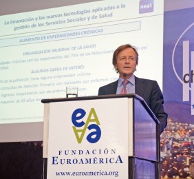 Como principal solución para afrontar estos desafíos presentó la aplicación de las nuevas tecnologías, con el objetivo de mejorar la gestión y aumentar la calidad de la salud y la prestación de los servicios sociales, además de lograr una disminución de los costes de los mismos.