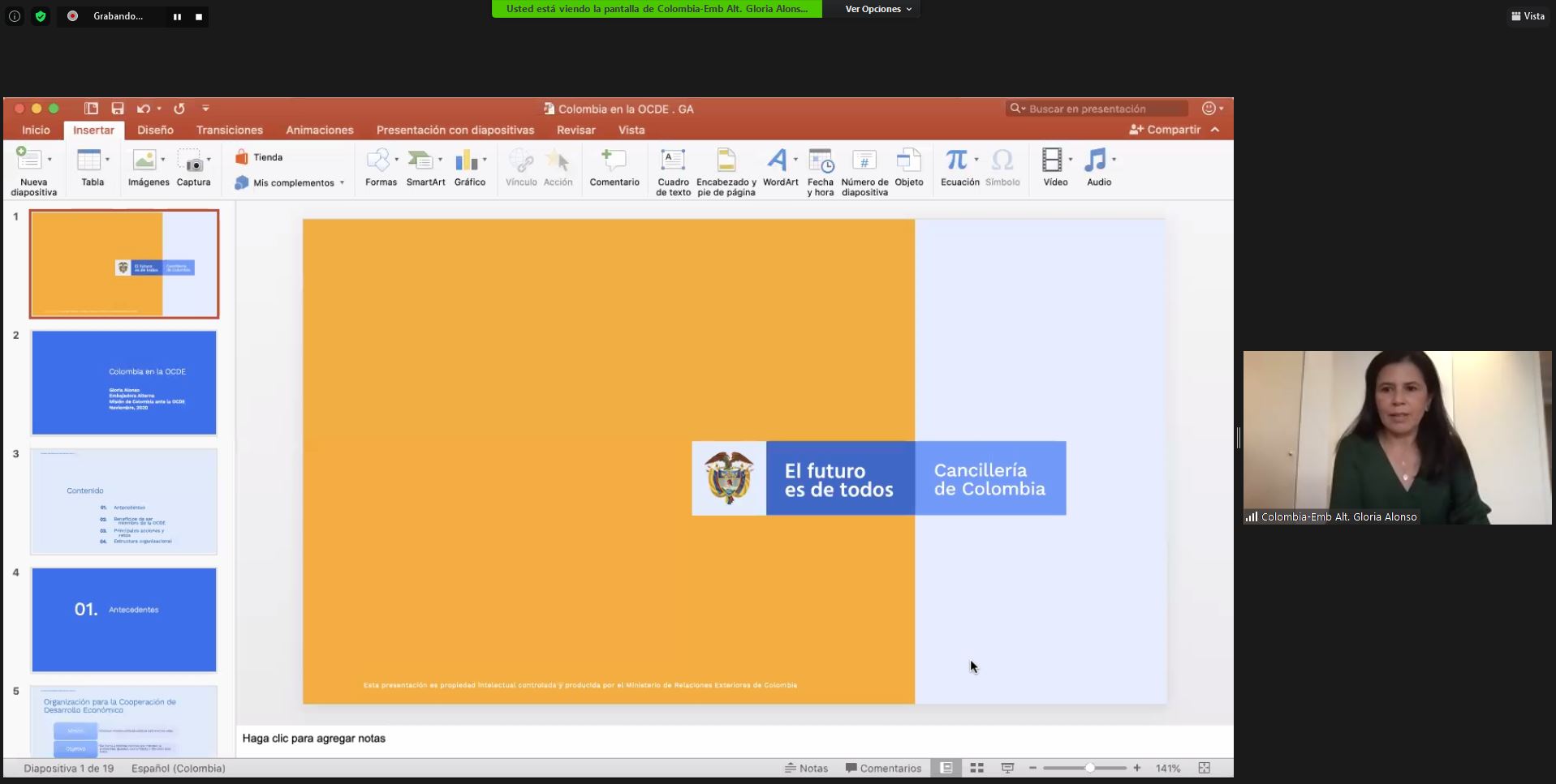 Recuerda este largo proceso desde el año 2008 en el que Colombia se hizo miembro del Centro de Desarrollo que es, de alguna manera, un grupo de trabajo anexo a la OCDE, pero es a partir de 2011 cuando Colombia inicia todo este proceso manifestando su interés de convertirse en miembro de la organización. En el año 2012, se recibe la invitación oficial para presentar la candidatura y el periodo 2013-2018, es un proceso de trabajo en el que la organización evalúa cada uno de los temas, se revisan estándares, instrumentos legales, etc. hasta que en 2018 la OCDE invita oficialmente a Colombia a ingresar en la Organización por cumplir estándares legales y técnicos. Entre 2018 y 2020, Colombia tuvo que llevar a cabo el proceso legal y constitucional para dirigirlo a la OCDE y cumplir con la revisión constitucional, lo que ocurrió entre el momento en que se aprueba la ley, el año 2019 y abril del presente año, cuando la Corte constitucional dijo que la ley está sujeta, por supuesto, a Constitución colombiana. En abril de 2020, se anunció formalmente el ingreso de Colombia a la organización.