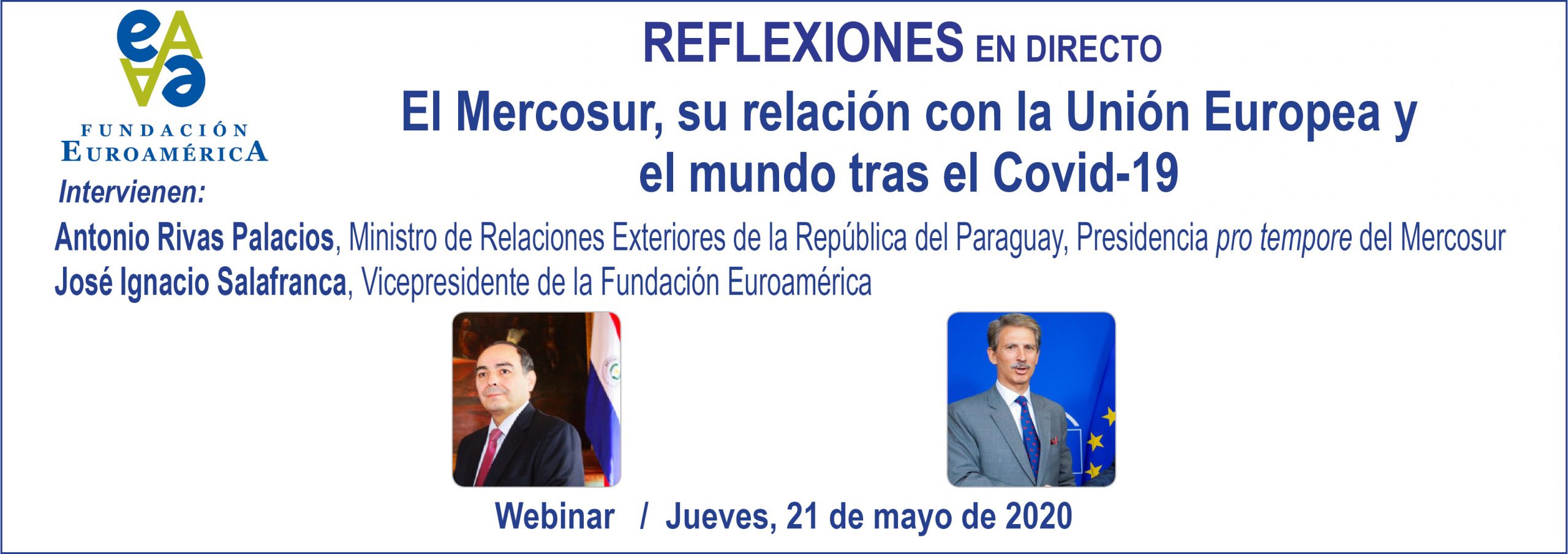 Canciller Antonio Rivas Palacios: Muchísimas gracias a ustedes, más que nada por el hecho de volver a ver mucha gente amiga en esta videoconferencia. Gracias a la Fundación Euroamérica por esta nueva oportunidad de estar con ustedes, al Presidente Jáuregui, al Vicepresidente Salafranca, a Ángel, a Luisa y a varios más. También creo que aquí el resumen final debe ser que aprovechemos esta situación y trabajemos en conjunto porque el acuerdo con la Unión Europea es una oportunidad renovada para que el Mercosur establezca los lazos importantes que tiene la región y para que sirva de puente también para otros mecanismos. Porque hay que destacar el hecho de que esta pandemia nos mostró de que, sí o sí, debemos apostar la integración.
