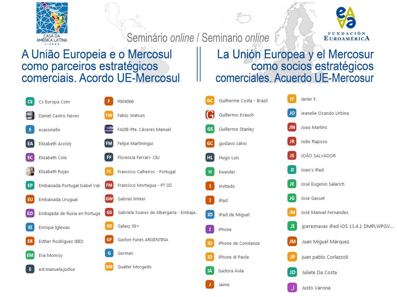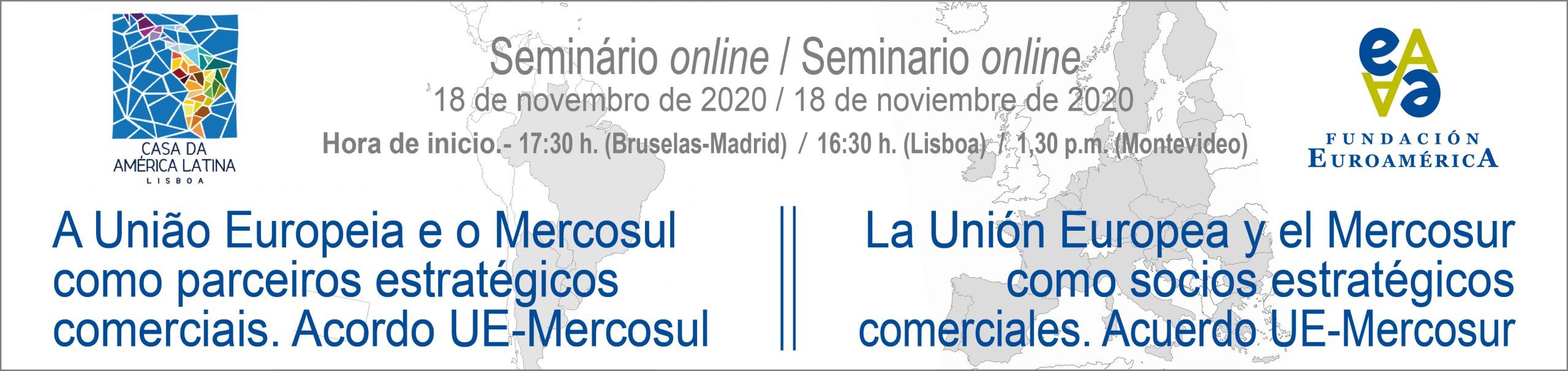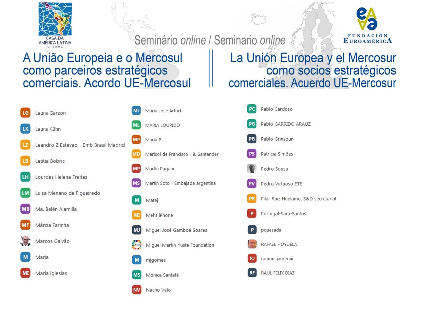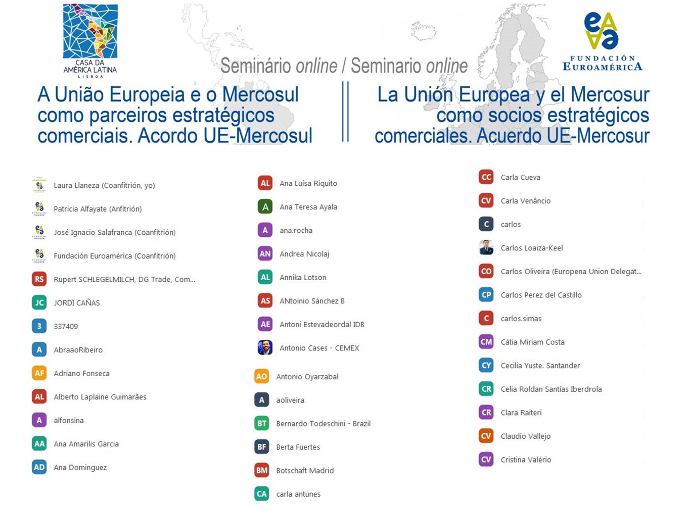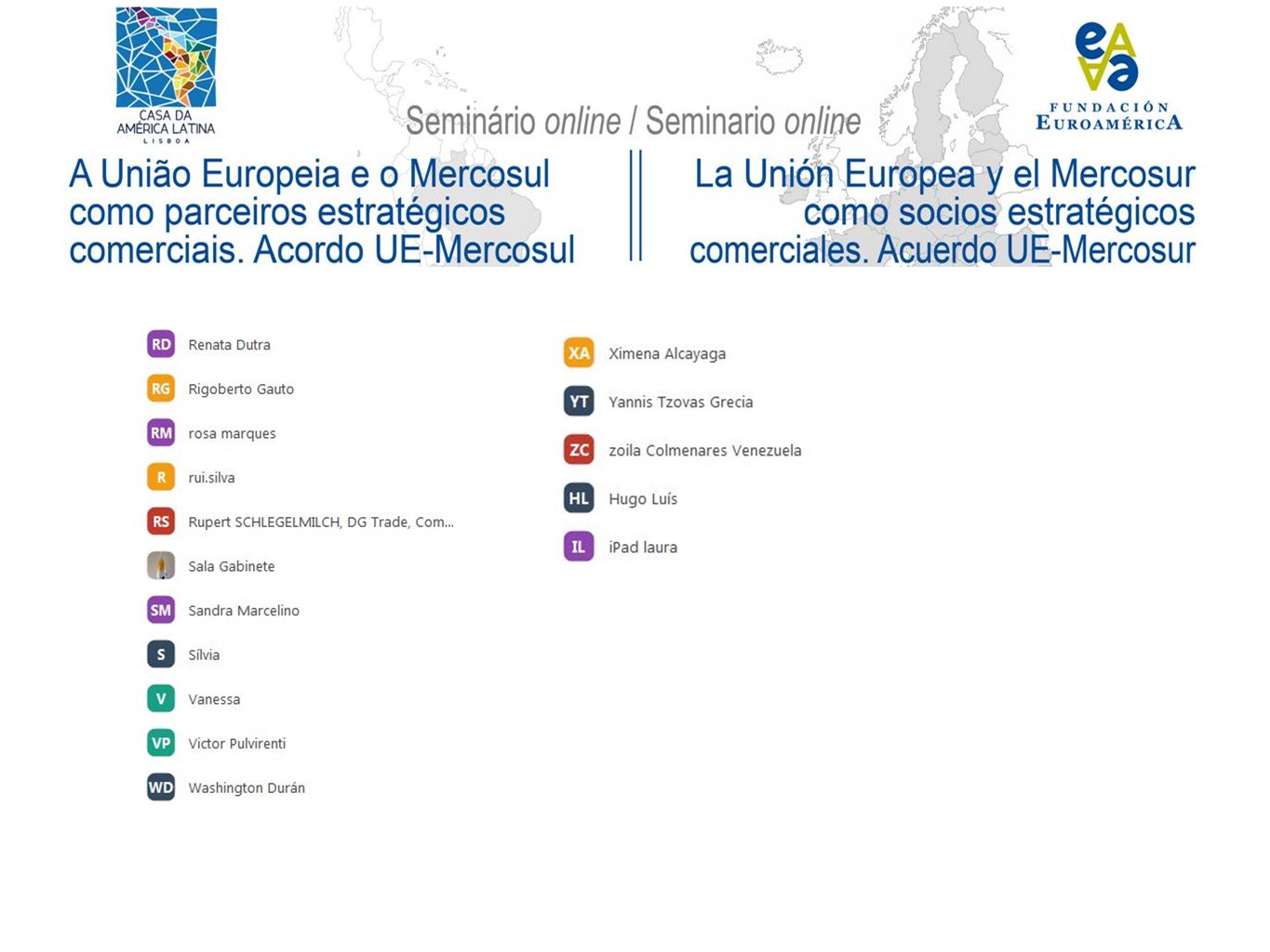 Alberto Laplaine Guimarãis, Presidente da Casa da América Latina (CAL) começou por saudar os participantes deste seminário e a parceria com a Fundação Euroamerica, uma parceria ganhadora e que pretendia organizar em Lisboa esta iniciativa. Não tendo sido possível devido à pandemia, o Presidente da CAL prometeu uma atividade futura em modo presencial, assim seja possível, discutindo os temas que tanto interessam às duas instituições e a um número crescente de pessoas, que veem nas relações Europa/América Latina e mais concretamente com o Mercosul, um campo determinante em termos da política externa, quer do ponto de vista europeu, quer do lado de Portugal, pois envolve um parceiro privilegiado, não só em termos económicos, mas também do ponto de vista político e geoestratégico na região, o Brasil.
