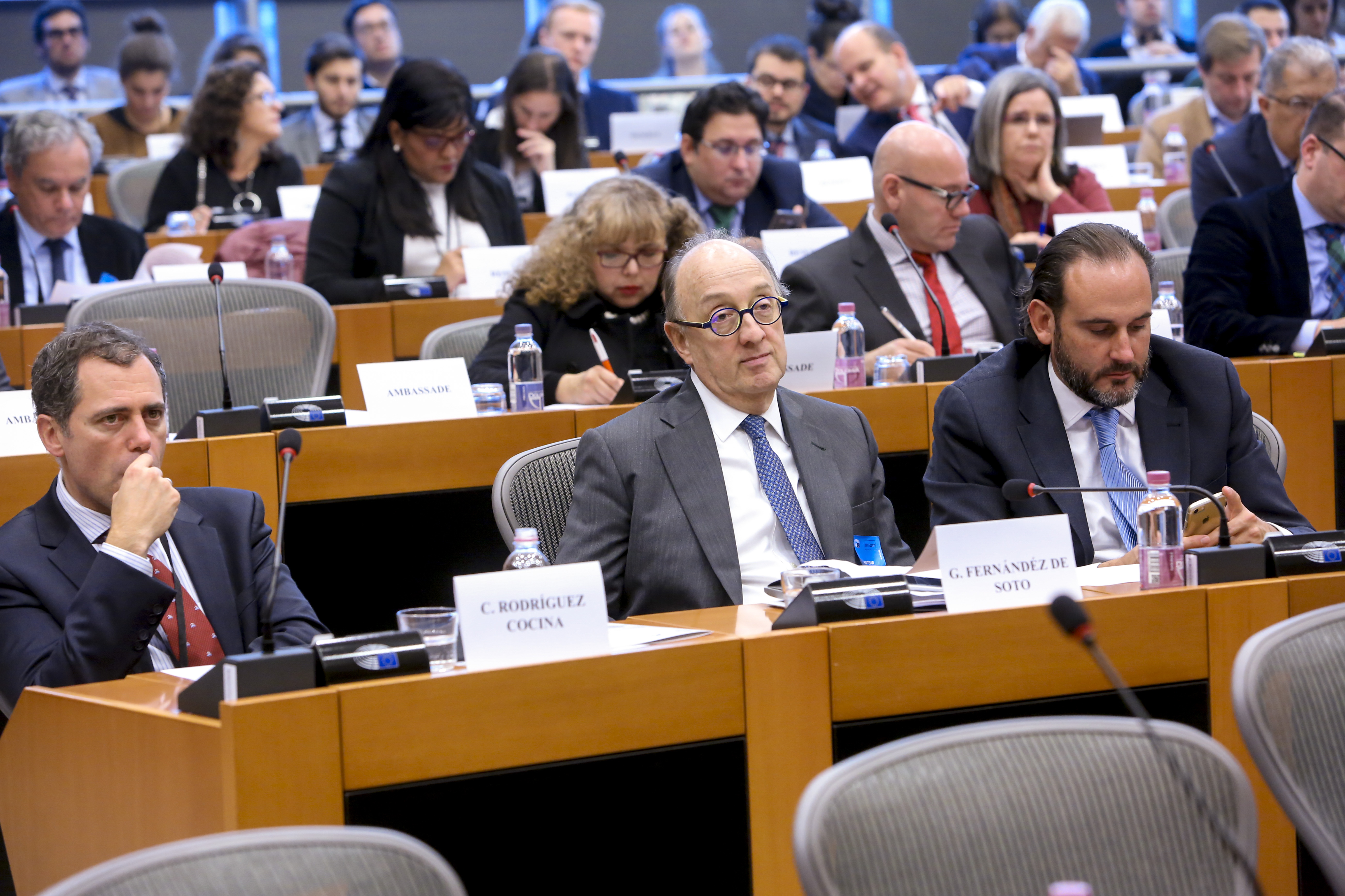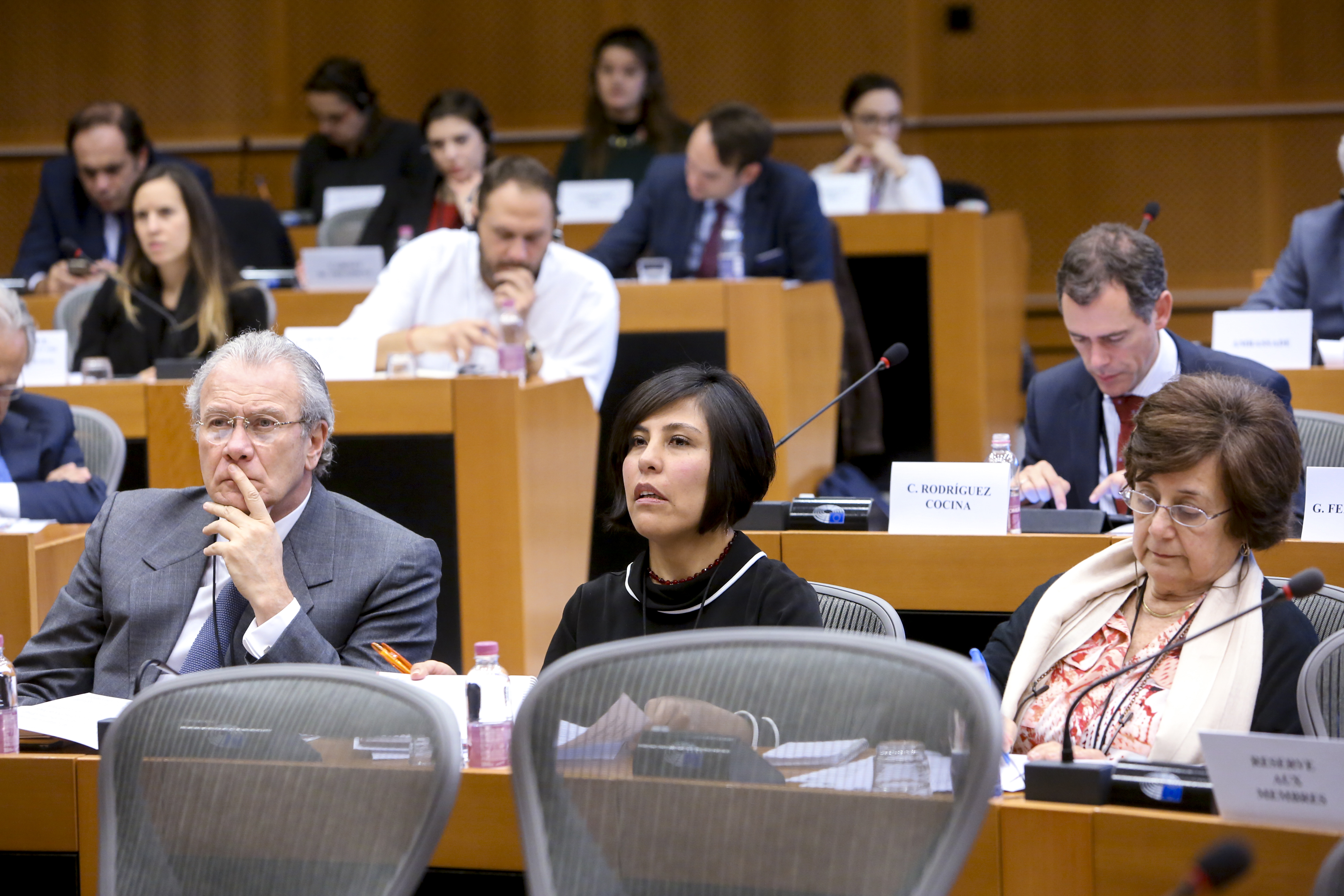 A continuación dio comienzo la tercera sesión cuya primera parte trató del Fortalecimiento del comercio entre la Unión Europea y las Américas frente a los proteccionismos. Tratados comerciales entre las dos regiones. Tomó la palabra en primer lugar la Eurodiputada Inmaculada Rodríguez-Piñero para quien “La evidencia empírica muestra que las economías abiertas crecen más rápidamente que las cerradas y disfrutan de un mayor nivel de riqueza y bienestar”. “Tenemos que crear las condiciones para que la globalización sea justa, inclusiva y más sostenible social y ambientalmente, de modo que la ciudadanía perciba que los acuerdos comerciales sirvan para mejorar su calidad de vida y para defender y proteger sus valores.” “Quiero destacar un informe aprobado en la última Asamblea de EuroLat en el que se defiende una posición conjunta de la UE y Latinoamérica a favor del multilateralismo de cara a la próxima Conferencia Ministerial de la OMC, a la que se pide que aborde desafíos tan urgentes como los derechos laborales, el comercio digital, la mayor incorporación de las Pymes al comercio internacional y la inclusión de la perspectiva de género en la política comercial, así como la creación de un instrumento internacional vinculante sobre empresas y derechos humanos en el marco de Naciones Unidas.” A continuación intervino el Eurodiputado José Ignacio Salafranca que indicó que “la UE es el principal inversor en América Latina pero no sabemos por cuánto tiempo ya que China nos está pisando los talones” “La UE tiene tres socios comerciales principales: Estados Unidos, China y Rusia y ha pintado un fresco muy interesante de liberalización de los dos tercios de nuestro comercio que son precisamente los que están fuera de estos tres países. En el ámbito multilateral, trabajamos con la OMC y en bilateral la UE tiene acuerdos muy importantes con Corea del Sur, Ghana, Costa de Marfil, África del Sur y Canadá (el más ambicioso y moderno concluido con un país tercero). Estamos negociando un acuerdo de inversiones con China; hemos ratificado en el PE los mandatos de directivas de negociación con Australia y con Nueva Zelanda; se ha cerrado un importantísimo acuerdo con Japón; hemos dado el estatus de SPG Plus a Sri Lanca y estamos avanzando con otros muchos países como Singapur, Tailandia y Myanmar. En relación a América Latina, se ha cerrado el acuerdo multiparte Perú-Colombia-Ecuador y el Acuerdo UE-América Central y ahora tenemos las tareas de modernización de los Acuerdos con México y con Chile. Y, por supuesto, la gran asignatura pendiente que es el acuerdo UE-Mercosur”. “Es importante que estos acuerdos se puedan concretar y culminar en los plazos previstos porque, en palabras del Presidente Juncker, son acuerdos que favorecen en especial a nuestras pequeñas y medianas empresas, crean más oportunidades para nuestros consumidores y fomentan la confianza y la inversión”.
