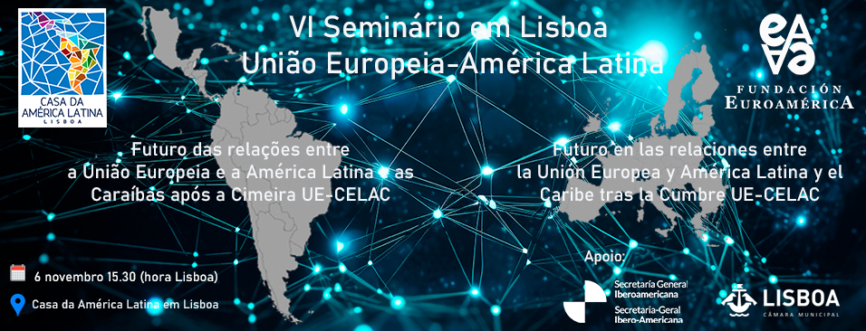 A Fundación Euroamérica e a Casa da América Latina em Lisboa, conscientes da importância de divulgar e difundir os resultados de ambas as reuniões entre os setores público e privado e a sociedade civil de ambos os lados do Atlântico, bem como de explicar o estado atual e as projeções futuras das relações entre as duas regiões, organizam este seminário. Intitulado «O futuro das relações entre a União Europeia e a América Latina e as Caraíbas após a Cimeira UE-CELAC», terá lugar na Casa da América Latina, em Lisboa, no dia 6 de novembro, como um espaço de debate produtivo e de contraposição de opiniões de especialistas de instituições europeias, de instituições multilaterais que trabalham com a região e do setor privado.