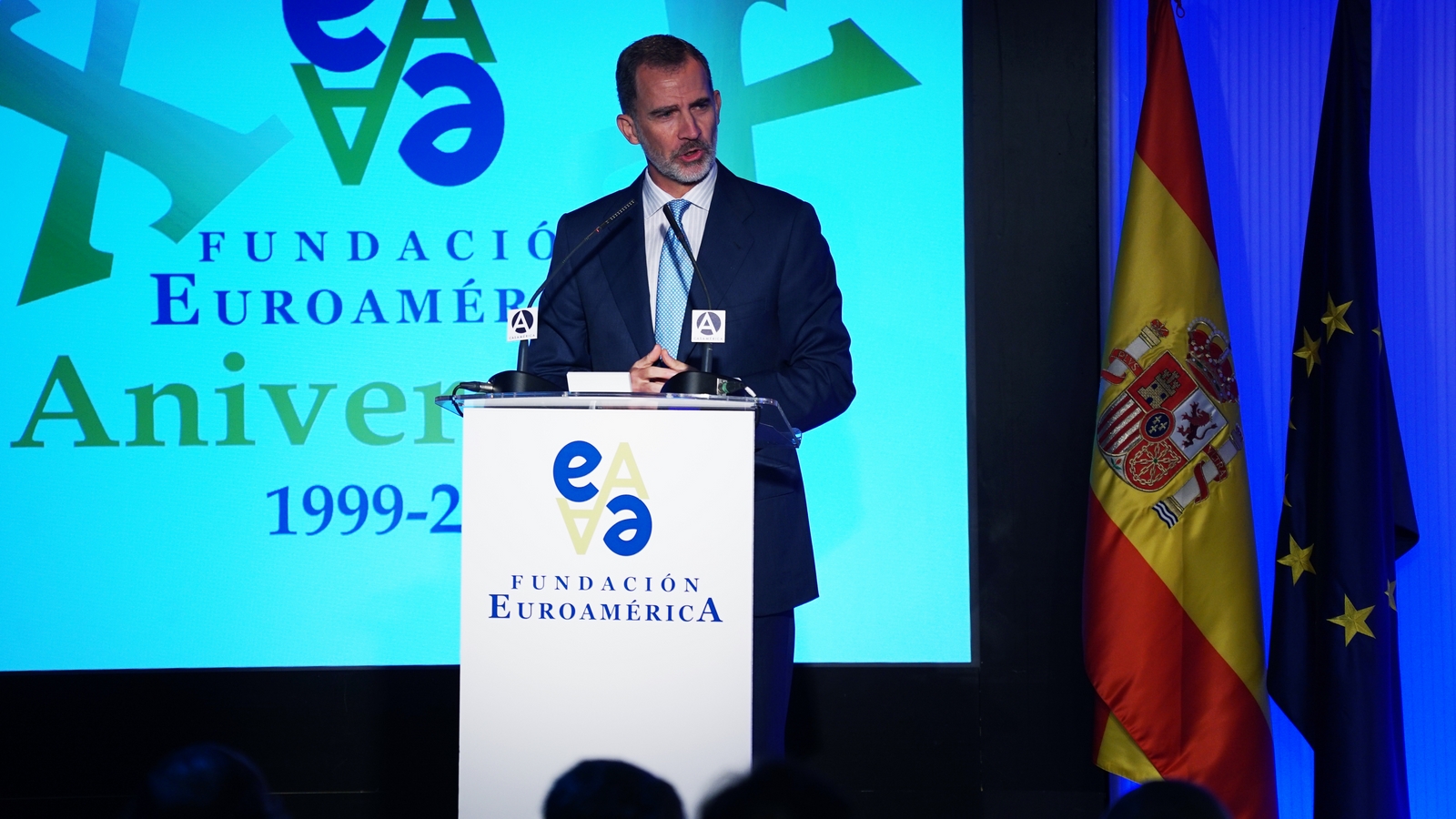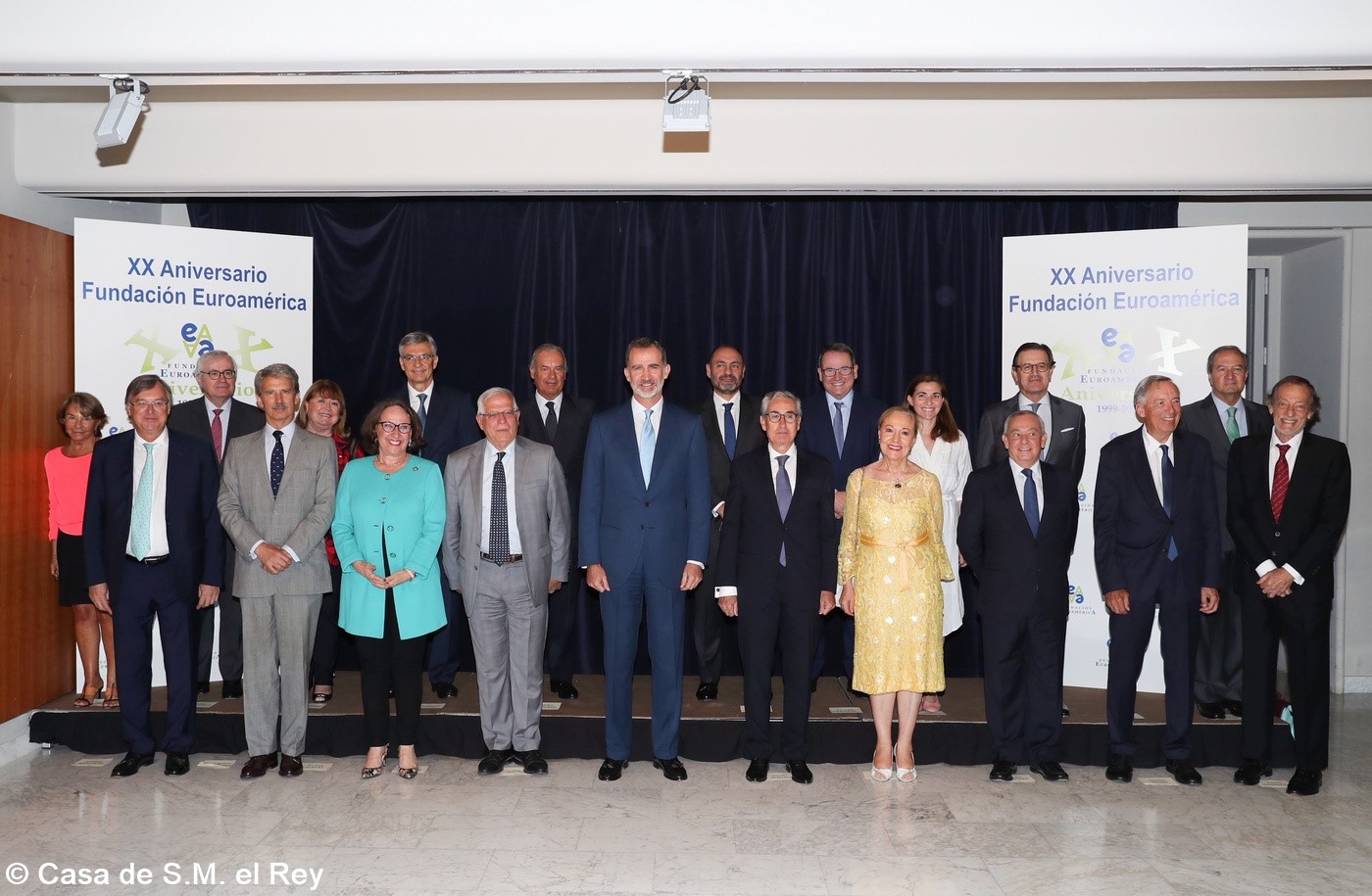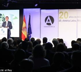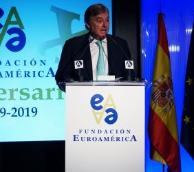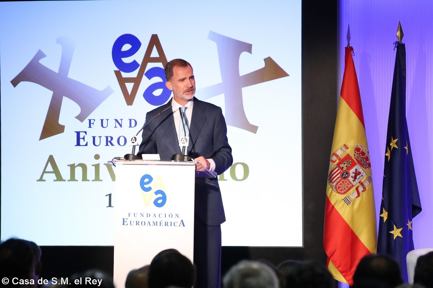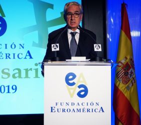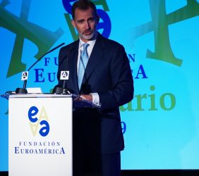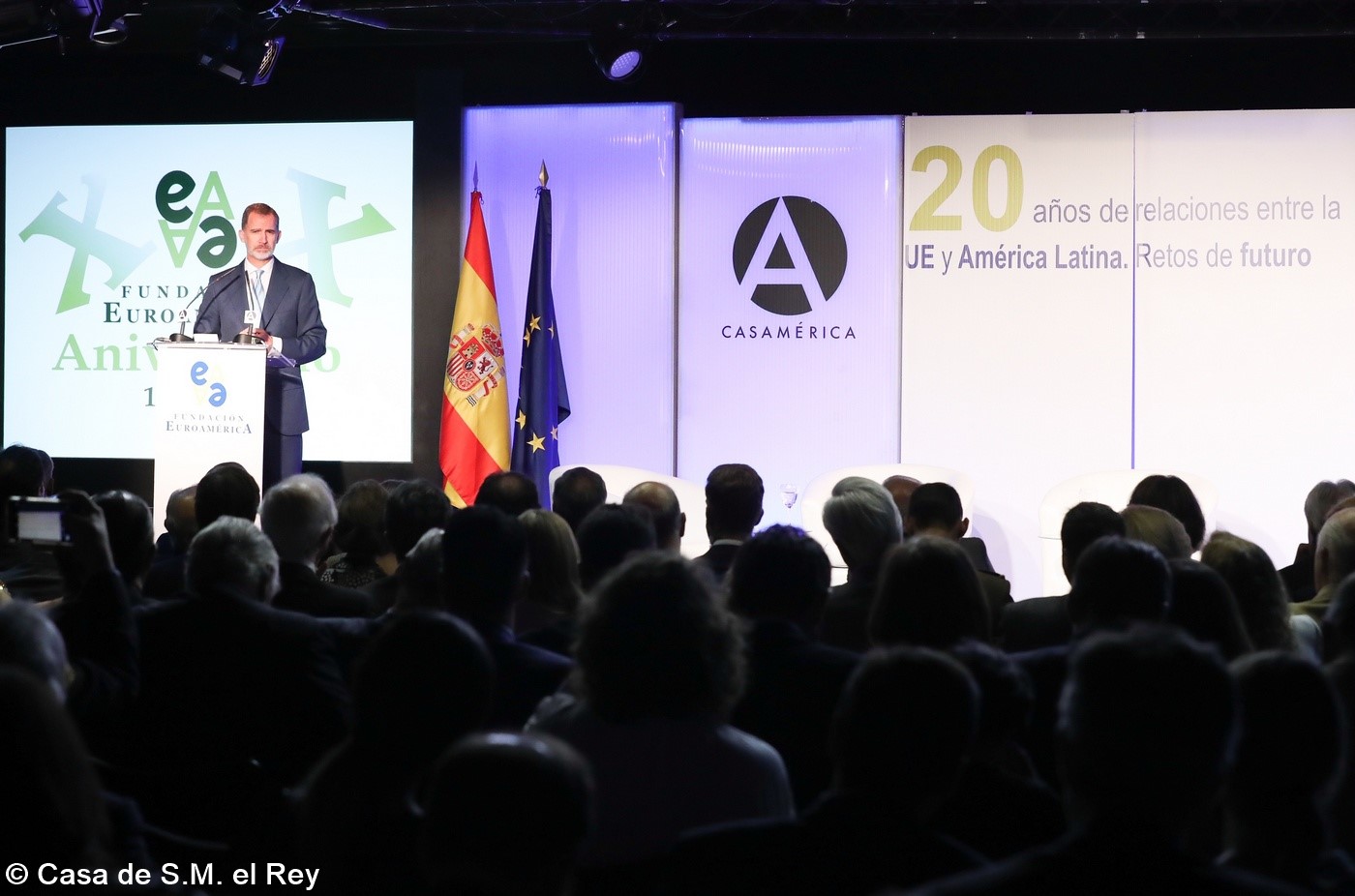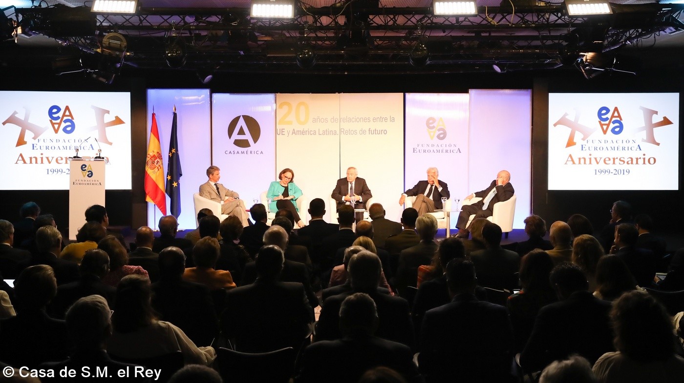 Casa de América. Madrid, 17.07.2019 Se cumplen 20 años de la creación de la Fundación Euroamérica. Y hace cinco, en mayo de 2014, tuve ya la satisfacción de poder celebrar su decimoquinto aniversario en uno de los últimos actos a los que asistí como Príncipe de Asturias. Así que permitidme que antes de nada felicite a todos los que hoy y a lo largo de las últimas dos décadas han trabajado para darle vida al noble propósito de la Fundación Euroamérica. Como bien sabemos, esta Fundación centra su actividad en un ámbito de la escena internacional que es esencial para España: las relaciones entre Europa y América. Desde esta orilla del Atlántico, España siempre ha aspirado a realizar una contribución sustancial a la relación entre ambos continentes, y el impulso de la Comunidad Iberoamericana de Naciones como amplio espacio para la concertación y la cooperación es buena prueba de ello. Porque ese impulso no está solo basado en nuestra especial conexión histórica, de lengua y cultura, en valores compartidos o en un interés económico privativo de España y Portugal; lo está también y de forma creciente en que lo creemos bueno para Europa -para la UE- y bueno para América Latina. Asumimos una responsabilidad actualizada, moderna y constructiva en el contexto de las relaciones internacionales. Además, esto no se reduce a unas directrices políticas o geoestratégicas de Estado, aunque estas son necesarias, indudablemente; y en nuestro caso, no es porque de alguna manera nos lo indique nuestra propia Constitución, que también. Hay que recordar, que los españoles -y también los portugueses- nos sentimos especialmente unidos a nuestros hermanos de Iberoamérica en el terreno de los afectos familiares, de lo emotivo. Nos importa de una manera más íntima lo que allá ocurre; un sentimiento que es -estoy convencido- de doble dirección. Y a partir de ahí, impregnados por ese vínculo humano, trabajamos por la construcción en todos los ámbitos posibles de una relación útil, responsable, respetuosa, equilibrada y con visión de futuro. En última instancia, la lengua o el espacio lingüístico común que compartimos con tantas naciones americanas nos posiciona en un lugar de especial cercanía tanto desde un punto de vista emocional, como desde una perspectiva cultural, económica y política en el mundo globalizado del siglo XXI. Al mismo tiempo, los Estados Unidos son igualmente un socio capital para España, y un país amigo por muchas razones… Pero una de ellas, naturalmente, es la herencia y presencia hispana tan importante y valiosa que tiene en muchas partes de su territorio, como tantas veces comprobamos en nuestras visitas. Por eso, cuando hablamos tanto de la importancia de las relaciones trasatlánticas, no debemos olvidar que a las que surgen entre los países de Occidente, esencialmente entre Europa y Norteamérica, tras la II GM y durante la guerra fría, debemos añadir la que representa hoy la gran familia iberoamericana y, por tanto, también la relación de Europa con América en su conjunto. Sinceramente, ese gran espacio puede y debe representar una contribución cada vez más importante al desarrollo equilibrado y pacífico de las relaciones internacionales, y a la capacidad de enfrentar los grandes desafíos de la agenda global. Desde su creación en 1999, la Fundación ha servido de punto de encuentro para acercar a europeos y americanos entre sí, debatiendo acerca de los principales temas en la agenda de la relación bilateral, particularmente a través de sus foros anuales. Madrid, Bruselas, Lima, Buenos Aires, La Antigua, Lisboa, Bogotá, Santiago de Chile, Miami, México D.F. y un sinfín de ciudades más han sido testigos tanto de este tipo de eventos como de distintos seminarios específicos donde figuras de incuestionable relevancia han aportado su experiencia y su conocimiento. Es absolutamente clave que organizaciones de esta naturaleza sigan trabajando en una línea que, sin duda, complementa el trabajo de las instituciones públicas. Para que el trabajo de estas organizaciones sea efectivo hacen falta liderazgos. Por ello, me gustaría referirme a la figura de Benita Ferrero-Waldner, quien deja la Presidencia de la Fundación tras un gran mandato: Benita es una de las grandes europeístas de nuestro tiempo; una figura de gran magnitud a la que no vamos a descubrir hoy aquí. Retirada ya de sus quehaceres diplomáticos, es ejemplo de generosidad, como ha demostrado a lo largo de los años al frente de la Fundación. No lo olvidemos, además de su paso por el sector privado, ha dejado su impronta también en Naciones Unidas, ha sido Secretaria de Estado, Ministra de Asuntos Exteriores y candidata a la presidencia de Austria, así como Comisaria Europea de Relaciones Exteriores y Comisaria de Comercio y Política Europea de Vecindad. Se trata de un bagaje profesional de altísima excelencia caracterizado por el servicio público. Benita, muchas gracias por tu labor al frente de la Fundación y por tu amistad y cariño hacia España, que también consideras en parte tuya. Tu entusiasmo y tu liderazgo a lo largo de este tiempo han sido encomiables. También por tu apoyo a la Corona, que te agradezco profunda y sinceramente. Ahora la Fundación ha tenido el gran acierto de elegir como sucesor a Ramón Jáuregui. Ramón ha tenido una larga e intensa trayectoria en la política española en todos los niveles. Además, es un magnífico y experimentado conocedor de las relaciones entre Europa y América. No en vano, en su condición de eurodiputado, formó parte de la Delegación de la Asamblea Parlamentaria Euro-Latinoamericana en la 7ª y 8ª legislaturas del Parlamento Europeo, siendo su Presidente durante los últimos cinco años. Estoy seguro de que pondrá todo su empeño, su vocación de servicio, su saber y su acreditada profesionalidad en esta nueva e ilusionante responsabilidad. Termino ya, pero no sin reiterar antes mi ag