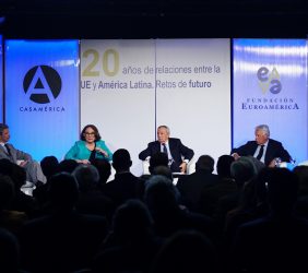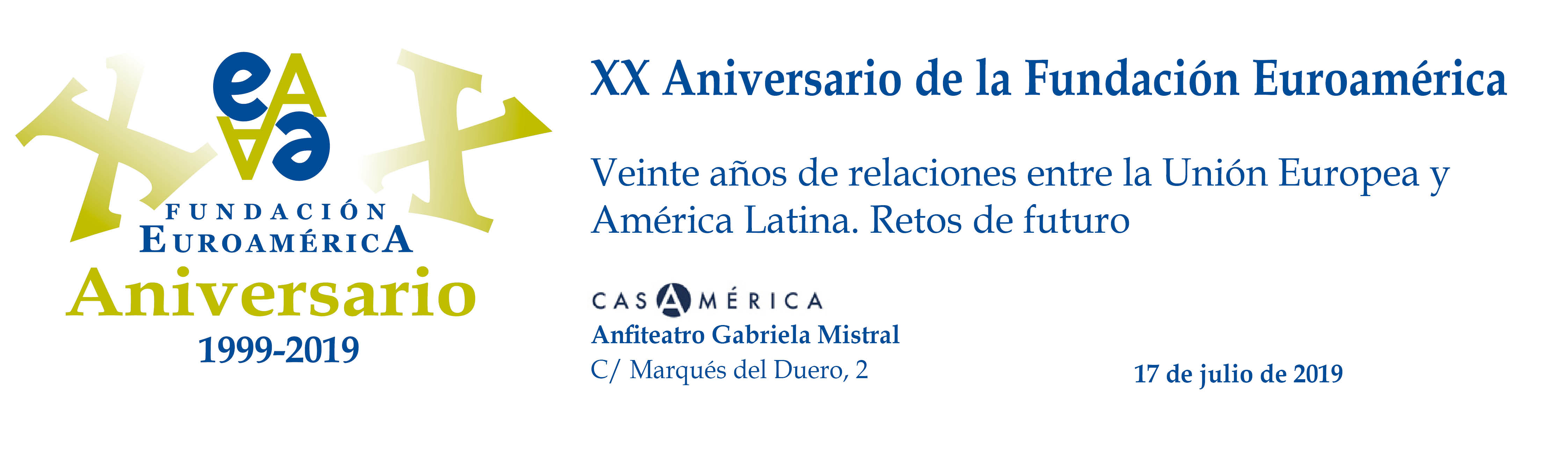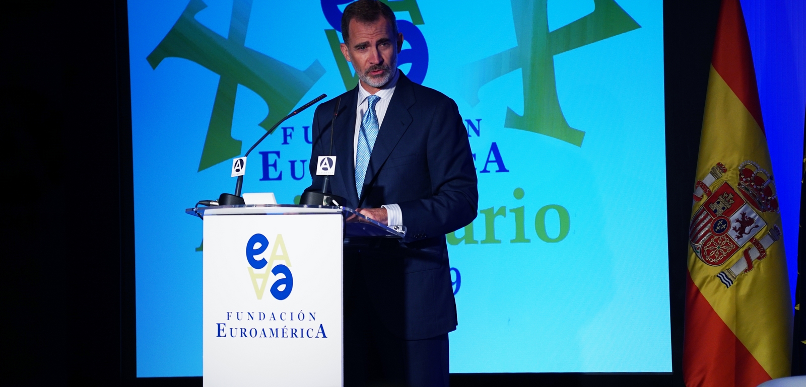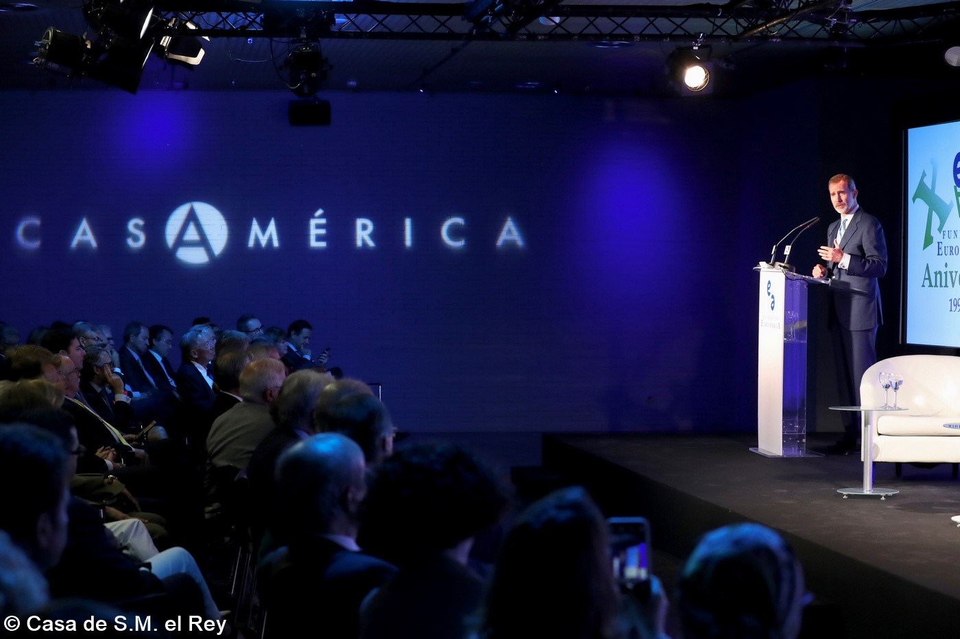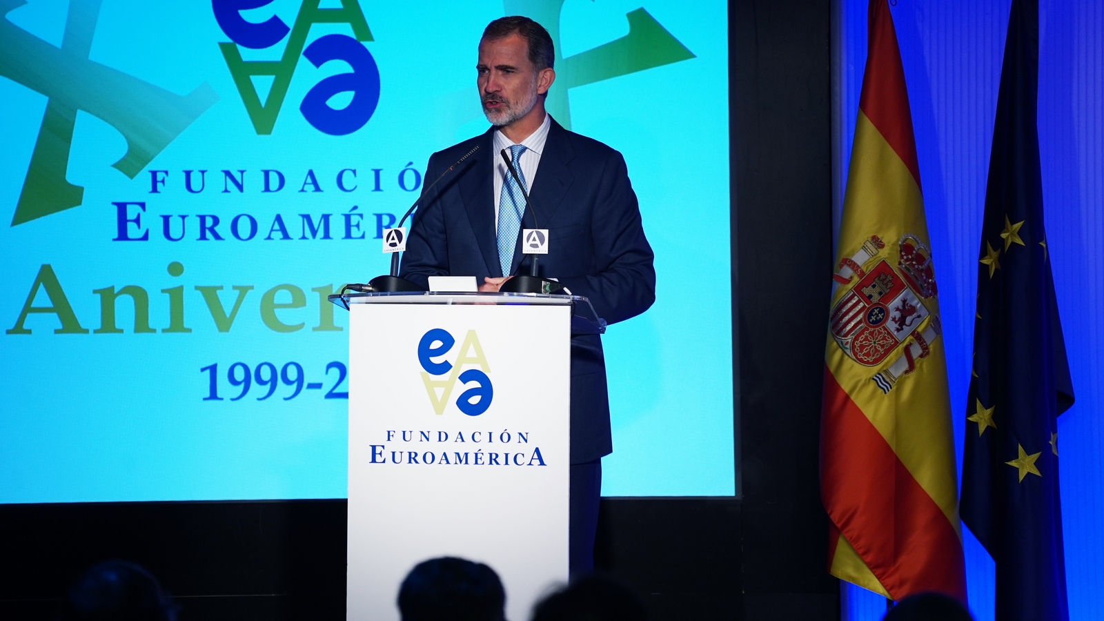 Casa de América. Madrid, 17.07.2019 Se cumplen 20 años de la creación de la Fundación Euroamérica. Y hace cinco, en mayo de 2014, tuve ya la satisfacción de poder celebrar su decimoquinto aniversario en uno de los últimos actos a los que asistí como Príncipe de Asturias. Así que permitidme que antes de nada felicite a todos los que hoy y a lo largo de las últimas dos décadas han trabajado para darle vida al noble propósito de la Fundación Euroamérica. Como bien sabemos, esta Fundación centra su actividad en un ámbito de la escena internacional que es esencial para España: las relaciones entre Europa y América. Desde esta orilla del Atlántico, España siempre ha aspirado a realizar una contribución sustancial a la relación entre ambos continentes, y el impulso de la Comunidad Iberoamericana de Naciones como amplio espacio para la concertación y la cooperación es buena prueba de ello. Porque ese impulso no está solo basado en nuestra especial conexión histórica, de lengua y cultura, en valores compartidos o en un interés económico privativo de España y Portugal; lo está también y de forma creciente en que lo creemos bueno para Europa -para la UE- y bueno para América Latina. Asumimos una responsabilidad actualizada, moderna y constructiva en el contexto de las relaciones internacionales. Además, esto no se reduce a unas directrices políticas o geoestratégicas de Estado, aunque estas son necesarias, indudablemente; y en nuestro caso, no es porque de alguna manera nos lo indique nuestra propia Constitución, que también. Hay que recordar, que los españoles -y también los portugueses- nos sentimos especialmente unidos a nuestros hermanos de Iberoamérica en el terreno de los afectos familiares, de lo emotivo. Nos importa de una manera más íntima lo que allá ocurre; un sentimiento que es -estoy convencido- de doble dirección. Y a partir de ahí, impregnados por ese vínculo humano, trabajamos por la construcción en todos los ámbitos posibles de una relación útil, responsable, respetuosa, equilibrada y con visión de futuro. En última instancia, la lengua o el espacio lingüístico común que compartimos con tantas naciones americanas nos posiciona en un lugar de especial cercanía tanto desde un punto de vista emocional, como desde una perspectiva cultural, económica y política en el mundo globalizado del siglo XXI. Al mismo tiempo, los Estados Unidos son igualmente un socio capital para España, y un país amigo por muchas razones… Pero una de ellas, naturalmente, es la herencia y presencia hispana tan importante y valiosa que tiene en muchas partes de su territorio, como tantas veces comprobamos en nuestras visitas. Por eso, cuando hablamos tanto de la importancia de las relaciones trasatlánticas, no debemos olvidar que a las que surgen entre los países de Occidente, esencialmente entre Europa y Norteamérica, tras la II GM y durante la guerra fría, debemos añadir la que representa hoy la gran familia iberoamericana y, por tanto, también la relación de Europa con América en su conjunto. Sinceramente, ese gran espacio puede y debe representar una contribución cada vez más importante al desarrollo equilibrado y pacífico de las relaciones internacionales, y a la capacidad de enfrentar los grandes desafíos de la agenda global. Desde su creación en 1999, la Fundación ha servido de punto de encuentro para acercar a europeos y americanos entre sí, debatiendo acerca de los principales temas en la agenda de la relación bilateral, particularmente a través de sus foros anuales. Madrid, Bruselas, Lima, Buenos Aires, La Antigua, Lisboa, Bogotá, Santiago de Chile, Miami, México D.F. y un sinfín de ciudades más han sido testigos tanto de este tipo de eventos como de distintos seminarios específicos donde figuras de incuestionable relevancia han aportado su experiencia y su conocimiento. Es absolutamente clave que organizaciones de esta naturaleza sigan trabajando en una línea que, sin duda, complementa el trabajo de las instituciones públicas. Para que el trabajo de estas organizaciones sea efectivo hacen falta liderazgos. Por ello, me gustaría referirme a la figura de Benita Ferrero-Waldner, quien deja la Presidencia de la Fundación tras un gran mandato: Benita es una de las grandes europeístas de nuestro tiempo; una figura de gran magnitud a la que no vamos a descubrir hoy aquí. Retirada ya de sus quehaceres diplomáticos, es ejemplo de generosidad, como ha demostrado a lo largo de los años al frente de la Fundación. No lo olvidemos, además de su paso por el sector privado, ha dejado su impronta también en Naciones Unidas, ha sido Secretaria de Estado, Ministra de Asuntos Exteriores y candidata a la presidencia de Austria, así como Comisaria Europea de Relaciones Exteriores y Comisaria de Comercio y Política Europea de Vecindad. Se trata de un bagaje profesional de altísima excelencia caracterizado por el servicio público. Benita, muchas gracias por tu labor al frente de la Fundación y por tu amistad y cariño hacia España, que también consideras en parte tuya. Tu entusiasmo y tu liderazgo a lo largo de este tiempo han sido encomiables. También por tu apoyo a la Corona, que te agradezco profunda y sinceramente. Ahora la Fundación ha tenido el gran acierto de elegir como sucesor a Ramón Jáuregui. Ramón ha tenido una larga e intensa trayectoria en la política española en todos los niveles. Además, es un magnífico y experimentado conocedor de las relaciones entre Europa y América. No en vano, en su condición de eurodiputado, formó parte de la Delegación de la Asamblea Parlamentaria Euro-Latinoamericana en la 7ª y 8ª legislaturas del Parlamento Europeo, siendo su Presidente durante los últimos cinco años. Estoy seguro de que pondrá todo su empeño, su vocación de servicio, su saber y su acreditada profesionalidad en esta nueva e ilusionante responsabilidad. Termino ya, pero no sin reiterar antes mi ag