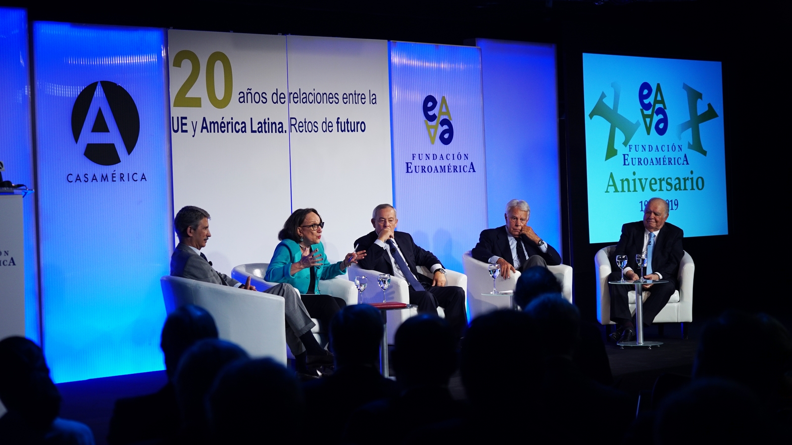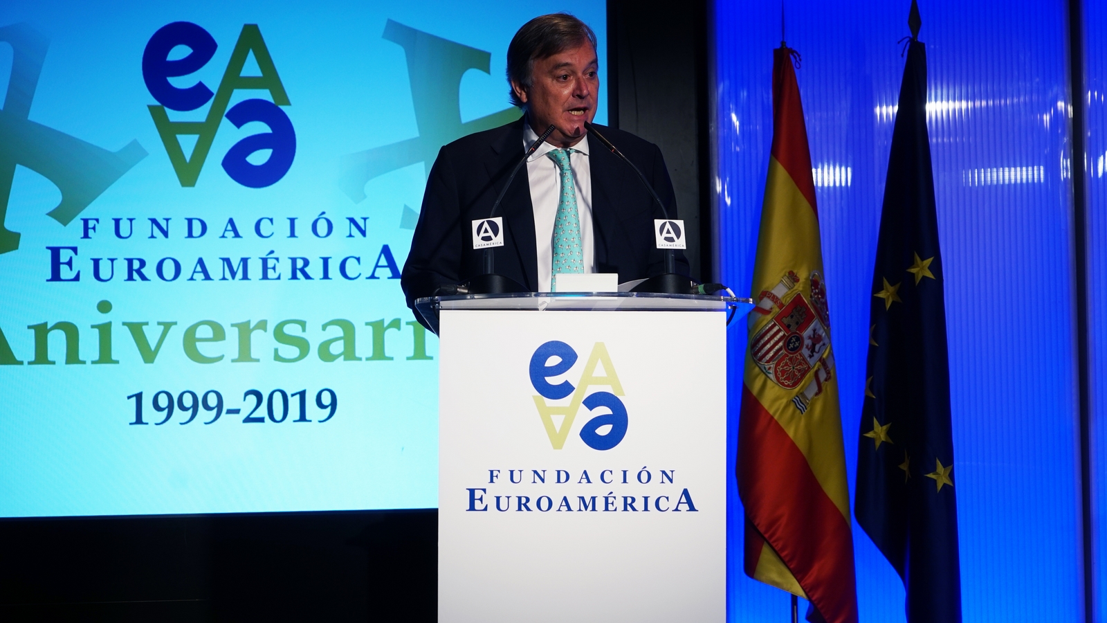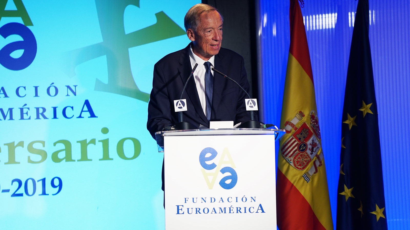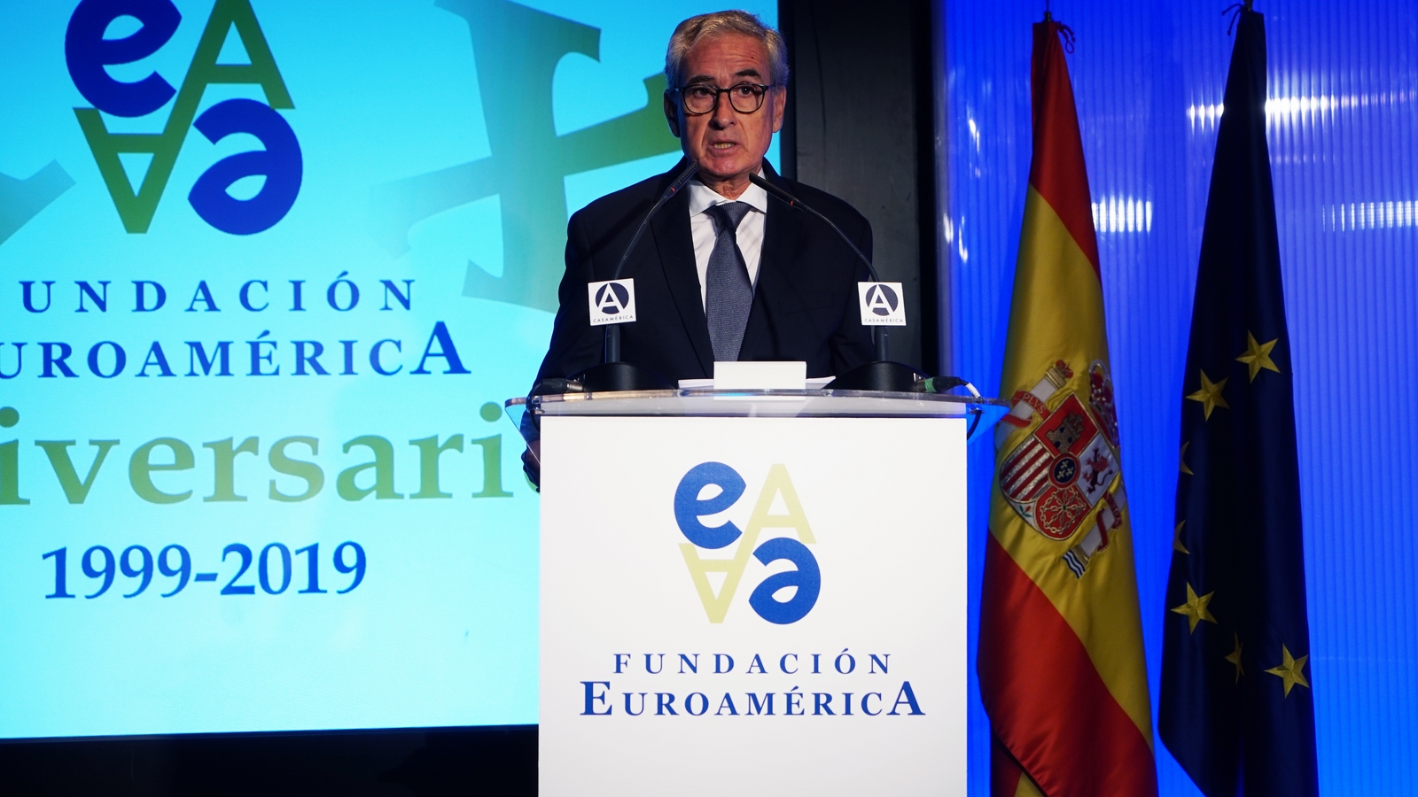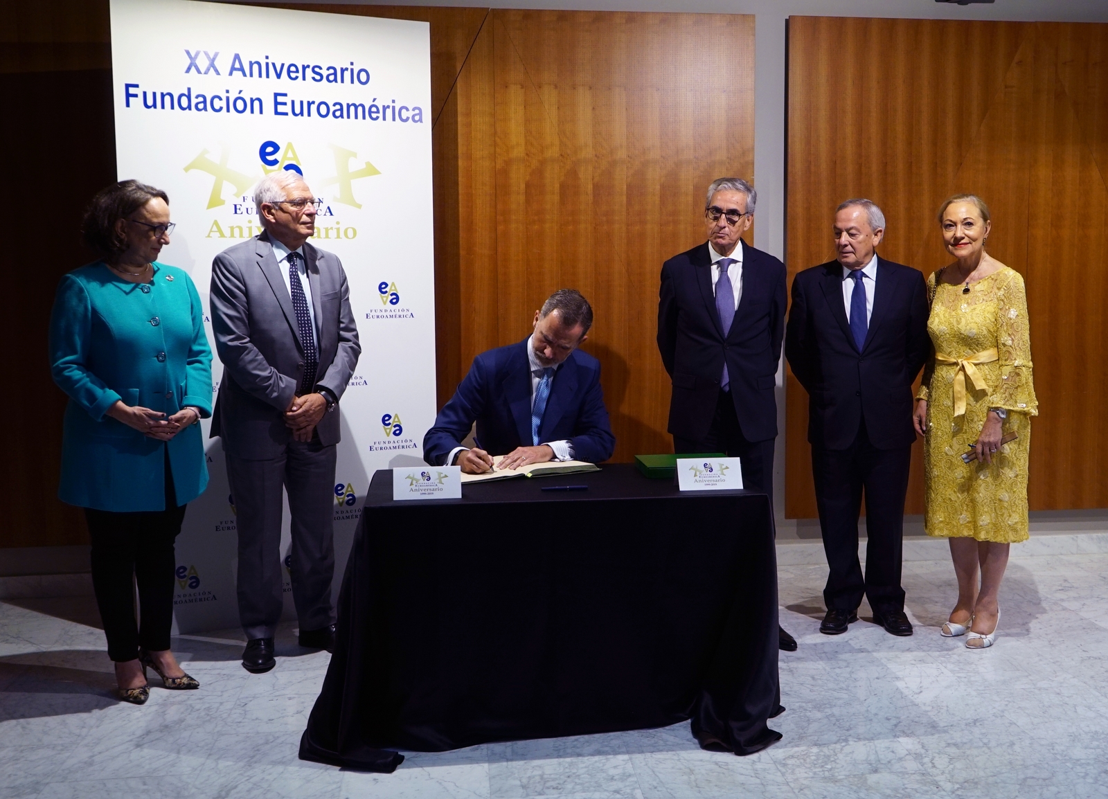 Casa de América. Madrid, 17.07.2019 Se cumplen 20 años de la creación de la Fundación Euroamérica. Y hace cinco, en mayo de 2014, tuve ya la satisfacción de poder celebrar su decimoquinto aniversario en uno de los últimos actos a los que asistí como Príncipe de Asturias. Así que permitidme que antes de nada felicite a todos los que hoy y a lo largo de las últimas dos décadas han trabajado para darle vida al noble propósito de la Fundación Euroamérica. Como bien sabemos, esta Fundación centra su actividad en un ámbito de la escena internacional que es esencial para España: las relaciones entre Europa y América. Desde esta orilla del Atlántico, España siempre ha aspirado a realizar una contribución sustancial a la relación entre ambos continentes, y el impulso de la Comunidad Iberoamericana de Naciones como amplio espacio para la concertación y la cooperación es buena prueba de ello. Porque ese impulso no está solo basado en nuestra especial conexión histórica, de lengua y cultura, en valores compartidos o en un interés económico privativo de España y Portugal; lo está también y de forma creciente en que lo creemos bueno para Europa -para la UE- y bueno para América Latina. Asumimos una responsabilidad actualizada, moderna y constructiva en el contexto de las relaciones internacionales. Además, esto no se reduce a unas directrices políticas o geoestratégicas de Estado, aunque estas son necesarias, indudablemente; y en nuestro caso, no es porque de alguna manera nos lo indique nuestra propia Constitución, que también. Hay que recordar, que los españoles -y también los portugueses- nos sentimos especialmente unidos a nuestros hermanos de Iberoamérica en el terreno de los afectos familiares, de lo emotivo. Nos importa de una manera más íntima lo que allá ocurre; un sentimiento que es -estoy convencido- de doble dirección. Y a partir de ahí, impregnados por ese vínculo humano, trabajamos por la construcción en todos los ámbitos posibles de una relación útil, responsable, respetuosa, equilibrada y con visión de futuro. En última instancia, la lengua o el espacio lingüístico común que compartimos con tantas naciones americanas nos posiciona en un lugar de especial cercanía tanto desde un punto de vista emocional, como desde una perspectiva cultural, económica y política en el mundo globalizado del siglo XXI. Al mismo tiempo, los Estados Unidos son igualmente un socio capital para España, y un país amigo por muchas razones… Pero una de ellas, naturalmente, es la herencia y presencia hispana tan importante y valiosa que tiene en muchas partes de su territorio, como tantas veces comprobamos en nuestras visitas. Por eso, cuando hablamos tanto de la importancia de las relaciones trasatlánticas, no debemos olvidar que a las que surgen entre los países de Occidente, esencialmente entre Europa y Norteamérica, tras la II GM y durante la guerra fría, debemos añadir la que representa hoy la gran familia iberoamericana y, por tanto, también la relación de Europa con América en su conjunto. Sinceramente, ese gran espacio puede y debe representar una contribución cada vez más importante al desarrollo equilibrado y pacífico de las relaciones internacionales, y a la capacidad de enfrentar los grandes desafíos de la agenda global. Desde su creación en 1999, la Fundación ha servido de punto de encuentro para acercar a europeos y americanos entre sí, debatiendo acerca de los principales temas en la agenda de la relación bilateral, particularmente a través de sus foros anuales. Madrid, Bruselas, Lima, Buenos Aires, La Antigua, Lisboa, Bogotá, Santiago de Chile, Miami, México D.F. y un sinfín de ciudades más han sido testigos tanto de este tipo de eventos como de distintos seminarios específicos donde figuras de incuestionable relevancia han aportado su experiencia y su conocimiento. Es absolutamente clave que organizaciones de esta naturaleza sigan trabajando en una línea que, sin duda, complementa el trabajo de las instituciones públicas. Para que el trabajo de estas organizaciones sea efectivo hacen falta liderazgos. Por ello, me gustaría referirme a la figura de Benita Ferrero-Waldner, quien deja la Presidencia de la Fundación tras un gran mandato: Benita es una de las grandes europeístas de nuestro tiempo; una figura de gran magnitud a la que no vamos a descubrir hoy aquí. Retirada ya de sus quehaceres diplomáticos, es ejemplo de generosidad, como ha demostrado a lo largo de los años al frente de la Fundación. No lo olvidemos, además de su paso por el sector privado, ha dejado su impronta también en Naciones Unidas, ha sido Secretaria de Estado, Ministra de Asuntos Exteriores y candidata a la presidencia de Austria, así como Comisaria Europea de Relaciones Exteriores y Comisaria de Comercio y Política Europea de Vecindad. Se trata de un bagaje profesional de altísima excelencia caracterizado por el servicio público. Benita, muchas gracias por tu labor al frente de la Fundación y por tu amistad y cariño hacia España, que también consideras en parte tuya. Tu entusiasmo y tu liderazgo a lo largo de este tiempo han sido encomiables. También por tu apoyo a la Corona, que te agradezco profunda y sinceramente. Ahora la Fundación ha tenido el gran acierto de elegir como sucesor a Ramón Jáuregui. Ramón ha tenido una larga e intensa trayectoria en la política española en todos los niveles. Además, es un magnífico y experimentado conocedor de las relaciones entre Europa y América. No en vano, en su condición de eurodiputado, formó parte de la Delegación de la Asamblea Parlamentaria Euro-Latinoamericana en la 7ª y 8ª legislaturas del Parlamento Europeo, siendo su Presidente durante los últimos cinco años. Estoy seguro de que pondrá todo su empeño, su vocación de servicio, su saber y su acreditada profesionalidad en esta nueva e ilusionante responsabilidad. Termino ya, pero no sin reiterar antes mi ag