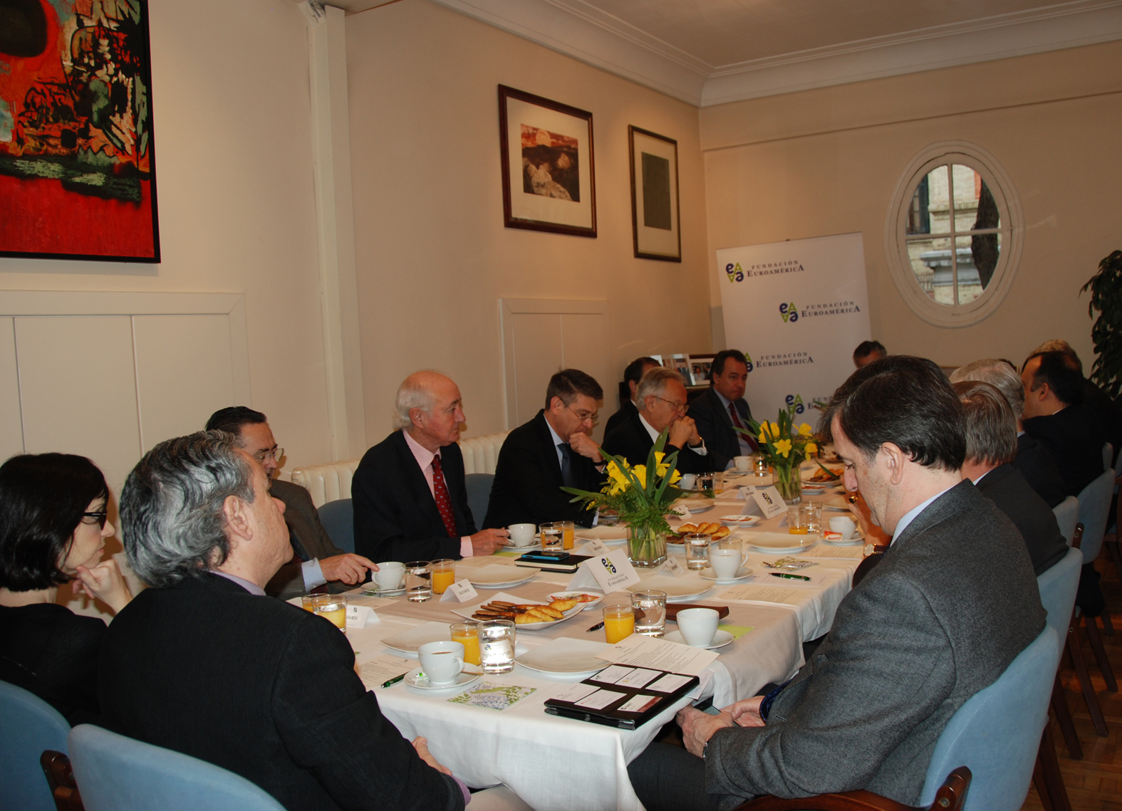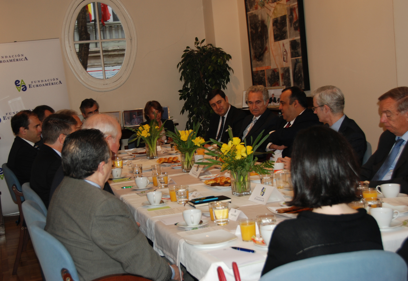 Destacó el sector de infraestructuras y el proyecto de crear dos puertos nuevos resaltando que ya hoy el sector logístico supone el 25% de la economía del país y el turismo el 10%. Panamá es un país seguro con un crecimiento superior a dos dígitos y con un desempleo aproximado al 4%. Retomando la importancia de la industria cinematográfica, comentó la creación de los Premios Platino de Cine Latinoamericano, que se celebrarán por vez primera en Panamá el próximo mes de abril, y que nacen con espíritu de continuidad y que se celebran en diferentes países anualmente. Estos premios, además de imagen-país, se consideran un elemento integrador en Centroamérica. En el coloquio posterior, se habló entre otros temas, de la importancia del Acuerdo Comercial Unión Europea- Centroamérica en negociación, que supondrá un claro impulso a las relaciones comerciales. Entre los temas de importancia a destacar de esta negociación se menciona la integración de aduanas y la homologación de certificados sanitarios entre otros. |