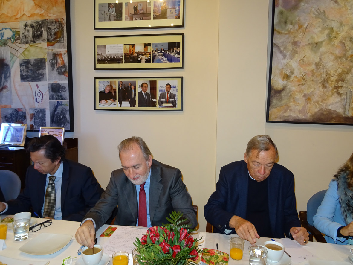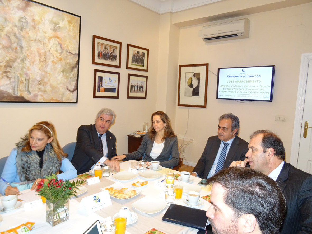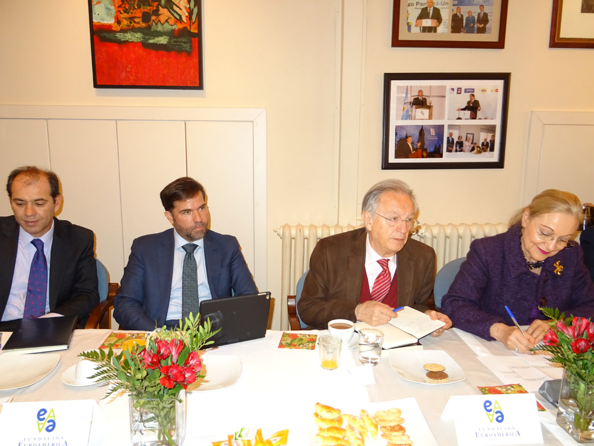 José María Beneyto habló a continuación de las relaciones de Estados Unidos y la Unión Europea con América Latina. Por un lado, habló del creciente proteccionismo del gobierno del Presidente Trump que, unido a la ausencia de una política estadounidense clara en relación a América Latina (basada casi exclusivamente en tres temas: México, Cuba y Venezuela), han dejado comercialmente el camino abierto en esa zona, lo que está siendo aprovechado por China. Y por otro, comentó la posición de la Unión Europea, con 650.000 millones de euros de stock en la región y dos grandes procesos comerciales en negociación, con Mercosur por un lado y la modernización del ya existente con México, por otro; ambos con posibilidades de firmarse en breve, lo que reforzaría las relaciones con América Latina. Sin embargo indicó igualmente el escaso debate político que dé una mayor visibilidad a la futura estrategia de la UE con respecto a Latinoamérica.