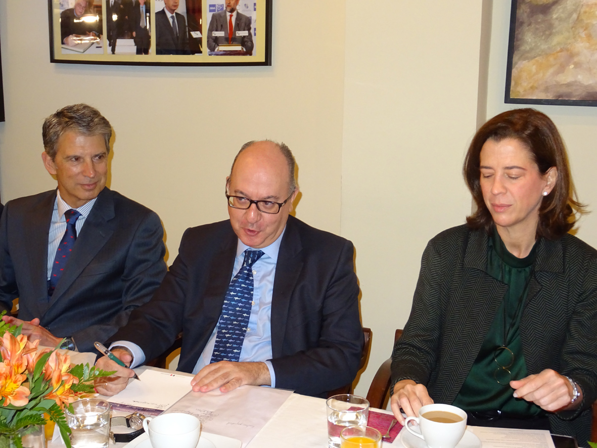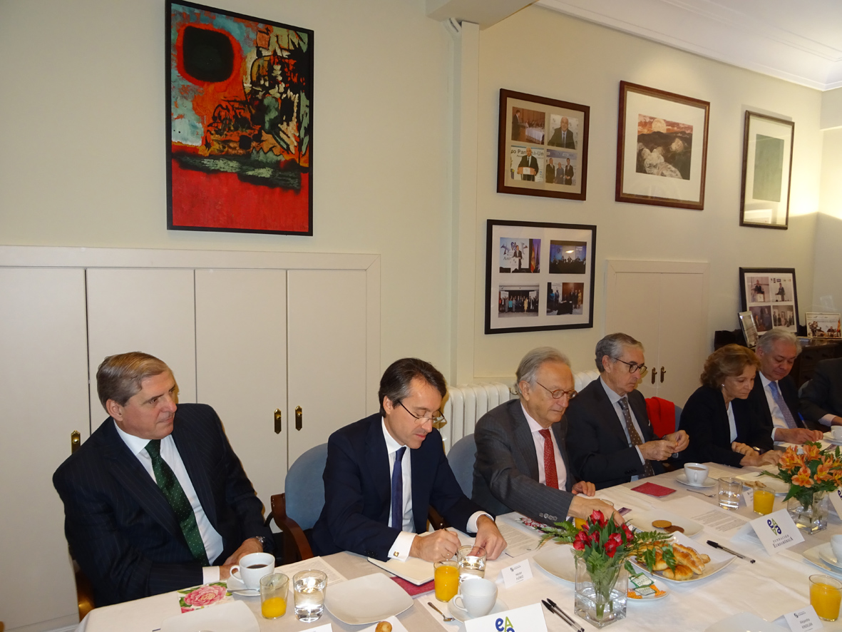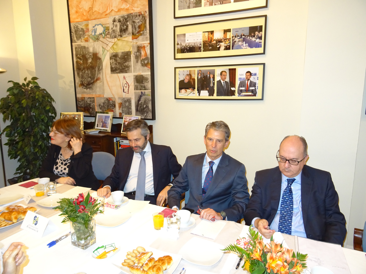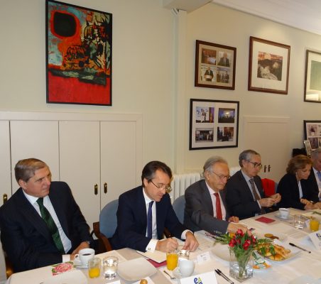 El Presidente de la AEB, José María Roldán, fue el nuevo invitado de honor de nuestros desayunos-coloquio. En una brillante intervención inicial comenzó indicando que la complicada situación política, con un arco parlamentario más diverso que nunca, obligaba al sector bancario a replantearse su operativa. Desde el punto de vista económico, destacó el momento cíclico de crecimiento blando por el que está atravesando, no sólo la economía española, si no la europea en general. Esta desaceleración en la economía, junto a las expectativas del BCE de mantenimiento en el medio-largo plazo de unos tipos de interés negativos, crean un entorno muy complejo del sistema bancario.