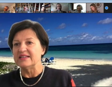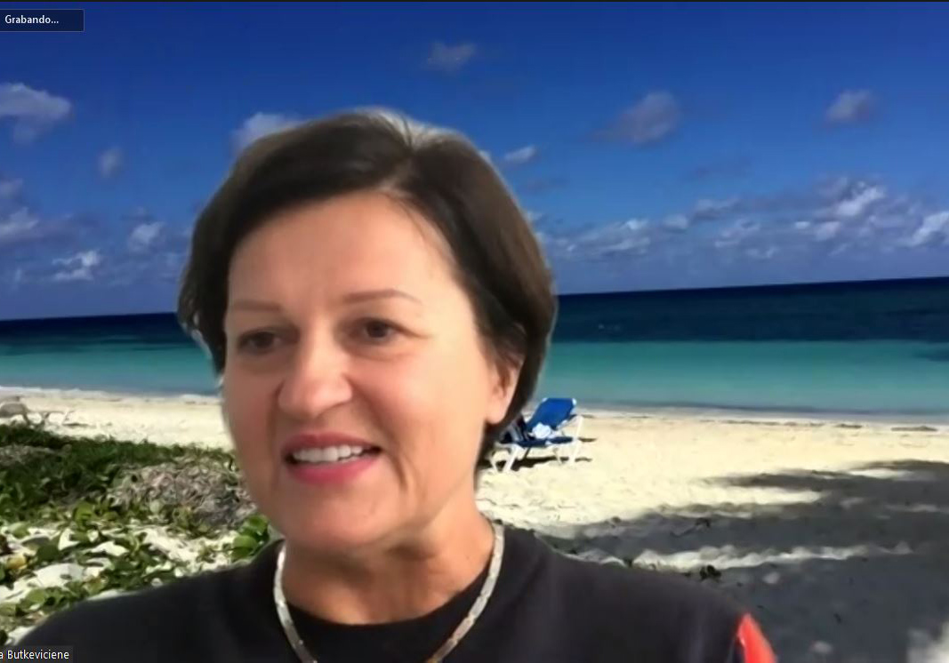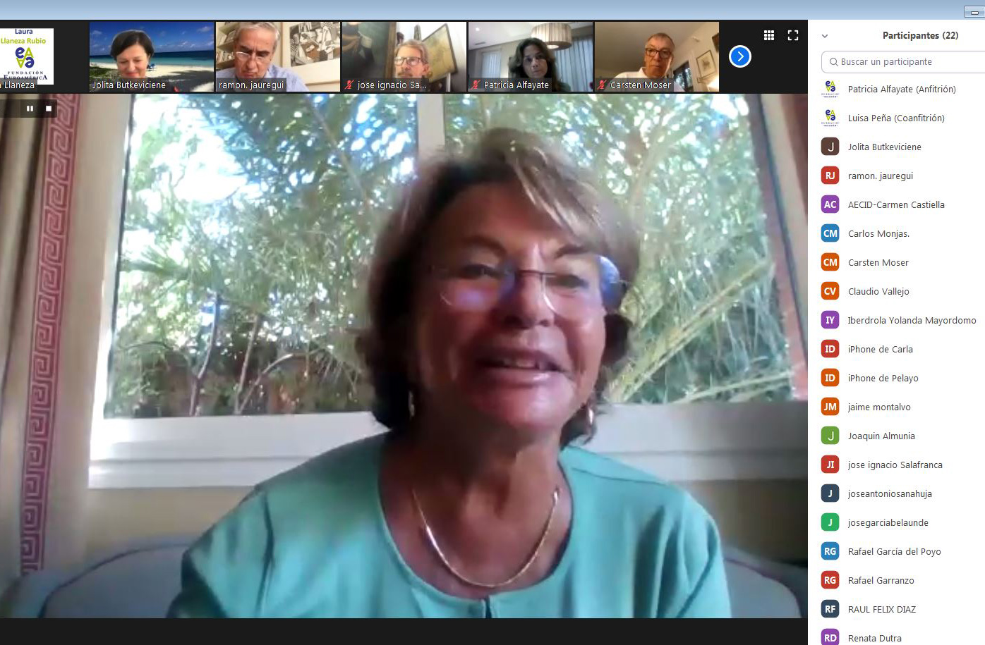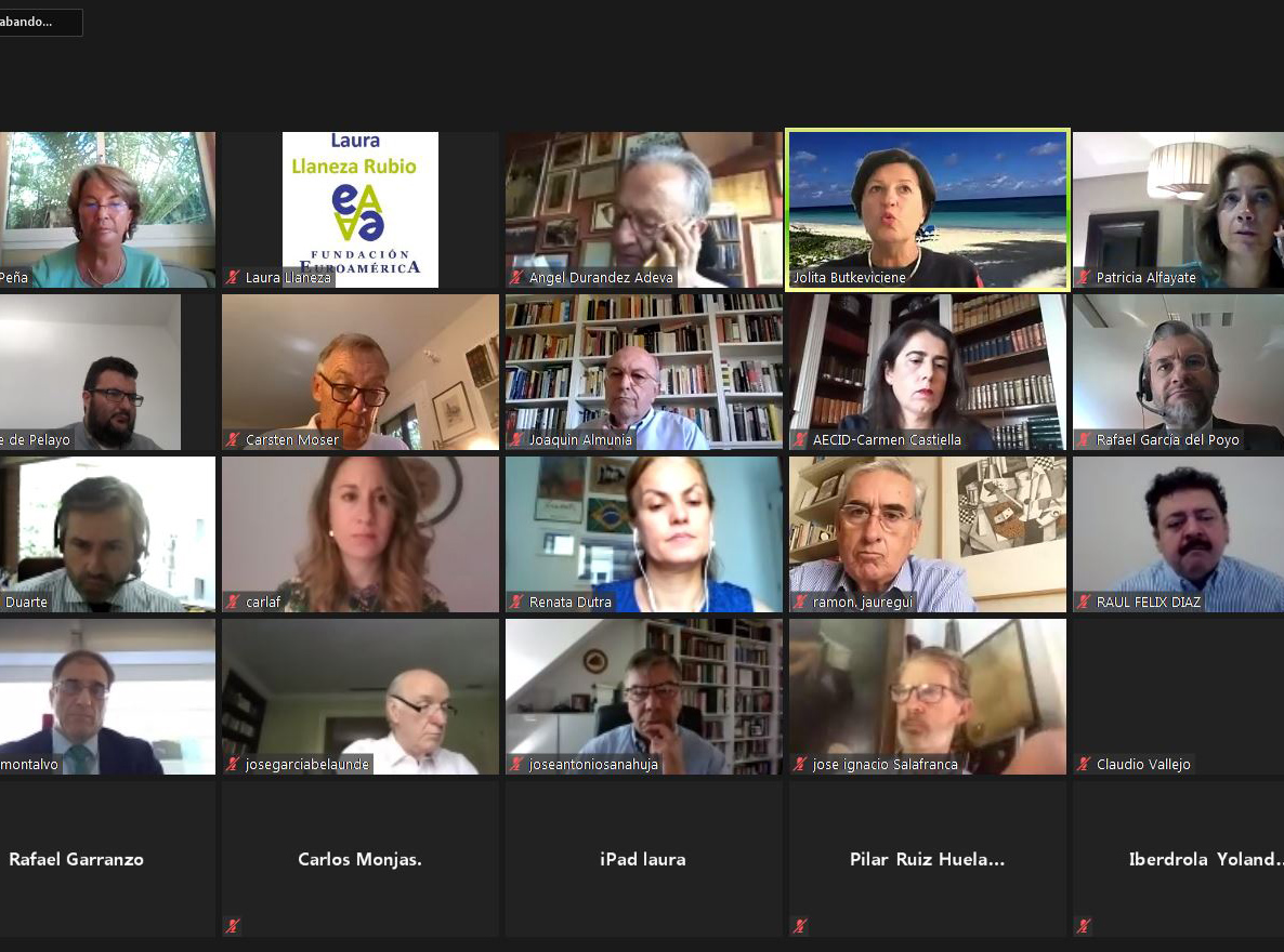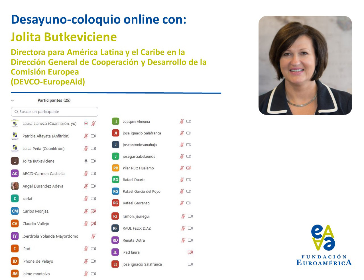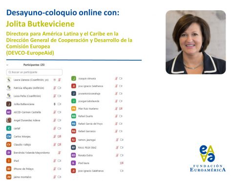 Después de las palabras de introducción y presentación del presidente Jáuregui, resaltando la gran  labor y la importante  cartera que gestiona la Sra. Butkeviciene como Directora para América Latina y el Caribe en la Dirección General de Cooperación y Desarrollo de la Comisión Europea, da comienzo a  su intervención centrándose en las perspectivas de la cooperación entre la UE y América Latina en este momento de crisis, tan complejo y con tanta incertidumbre, expresando el interés de la UE de elevar el nivel de esta relación y cooperación. “La relación entre ambos no puede entenderse como un ente aislado; la cooperación, el diálogo, han sido un motor fundamental para el multilateralismo global y han estado detrás de grandes logros como el acuerdo de París o la Agenda 2030”. “Esta cooperación siempre ha sido un banco de pruebas, un modelo para analizar los límites de las estructuras de cooperación”. A las puertas del nuevo Marco Financiero Plurianual, “se plantea un cambio estructural en nuestra forma de cooperación con los países-socios y el papel de Latinoamérica será de nuevo clave en este diseño”. “El multilateralismo no está roto, solamente hay que reinventarlo y con Latinoamérica está más preparado ahora para responder a la crisis que hace 7 años. Entonces se veía la región dividida entre países pobres y ricos, pero hoy los visualizamos como países-socios y podemos profundizar en nuestra cooperación regional sobre agendas comunes y bienes públicos”. “Los objetivos de la agenda 2030, supusieron un cambio hacia una visión multidimensional de los procesos de desarrollo y los retos pasan a ser compartidos y las realidades descritas por índices más complejos. Si tenemos una visión más amplia, tenemos que ampliar también la forma de relacionarnos y  en la que cooperamos; hay que revisar y analizar si los instrumentos de cooperación corresponden a esta realidad y si son capaces de dar respuestas que se ajustan a realidades más complejas, más ambiciosas”.