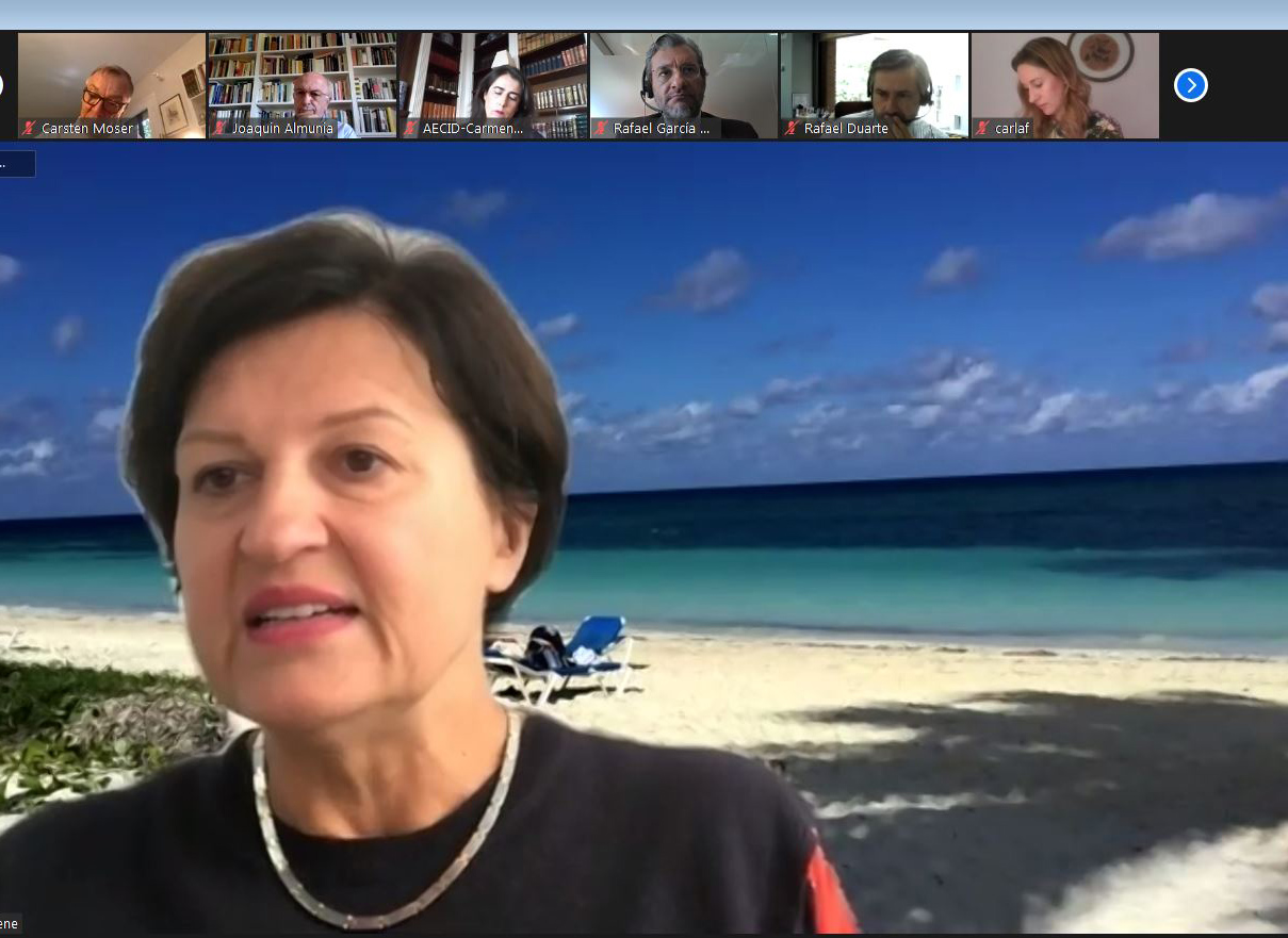 En el coloquio posterior interviene la Directora de Cooperación con América Latina y el Caribe de AECID, Carmen Castiella, destacando la importancia de la cooperación y de que la UE apueste por América Latina. También lo hace Jose Antonio Sanahuja destacando el reconocimiento del trabajo hecho y destaca el enfoque más avanzado de la cooperación que deja atrás el concepto de graduación.