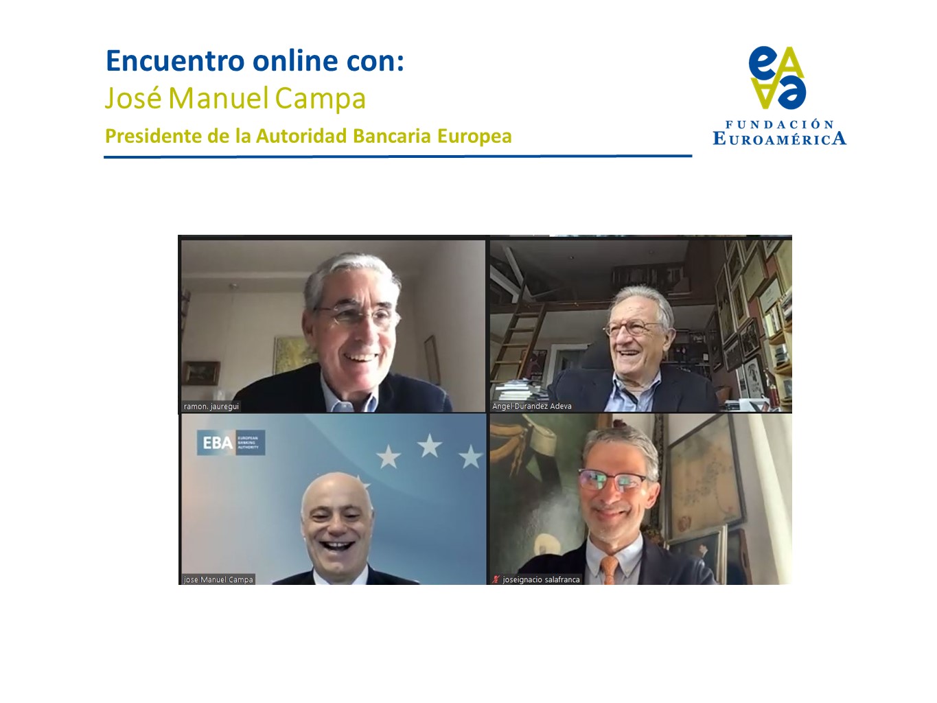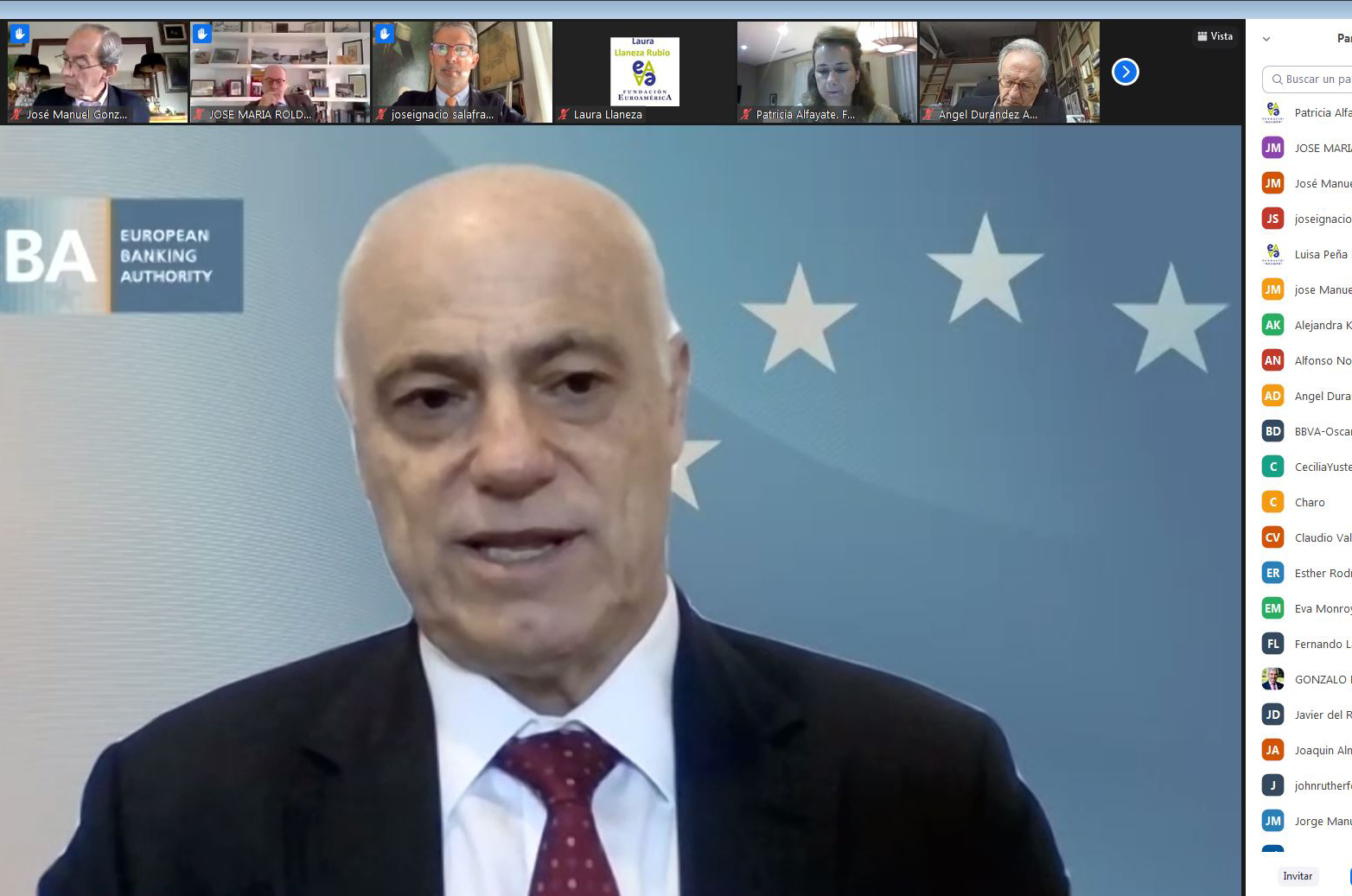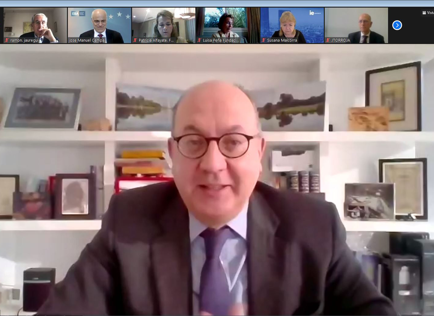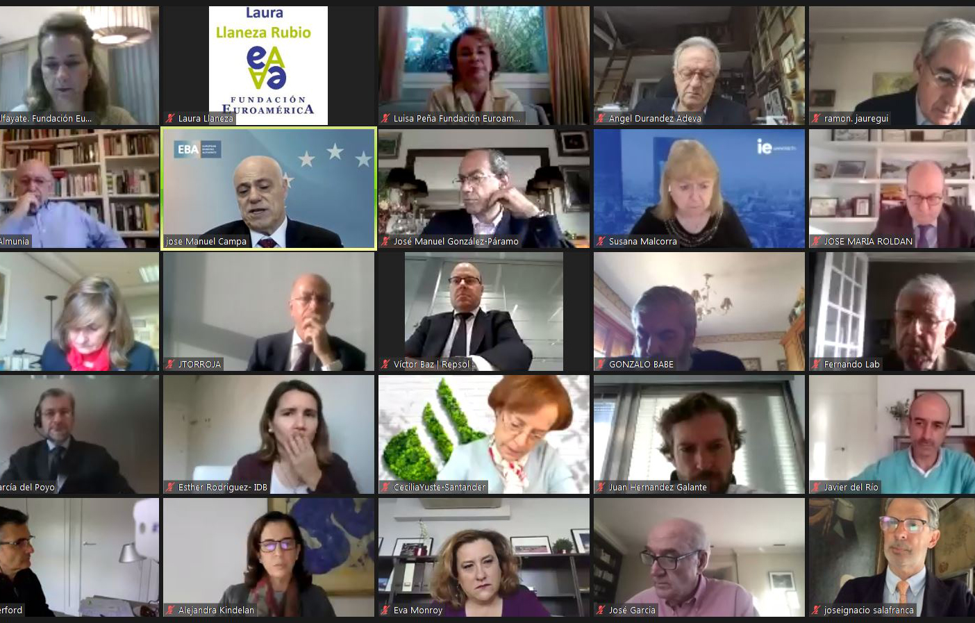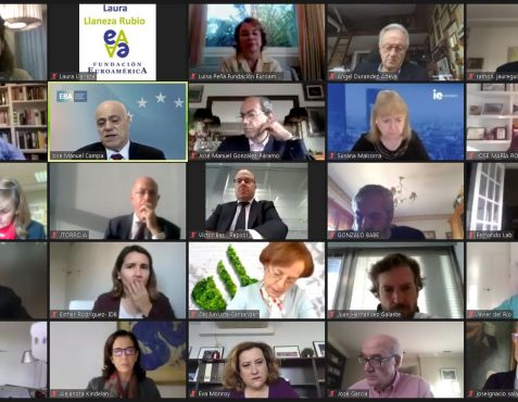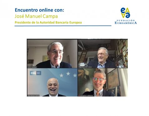 Comenzó el Presidente de la Fundación Euroamérica presentando a José Manuel Campa para examinar el estado del sistema financiero y del sistema bancario de la Unión Europea, en un contexto muy singular “de triple crisis que estamos viviendo, con tasas de interés bajísimas; transformación o reconversión tecnológica de todo el sistema financiero, y pandemia”.