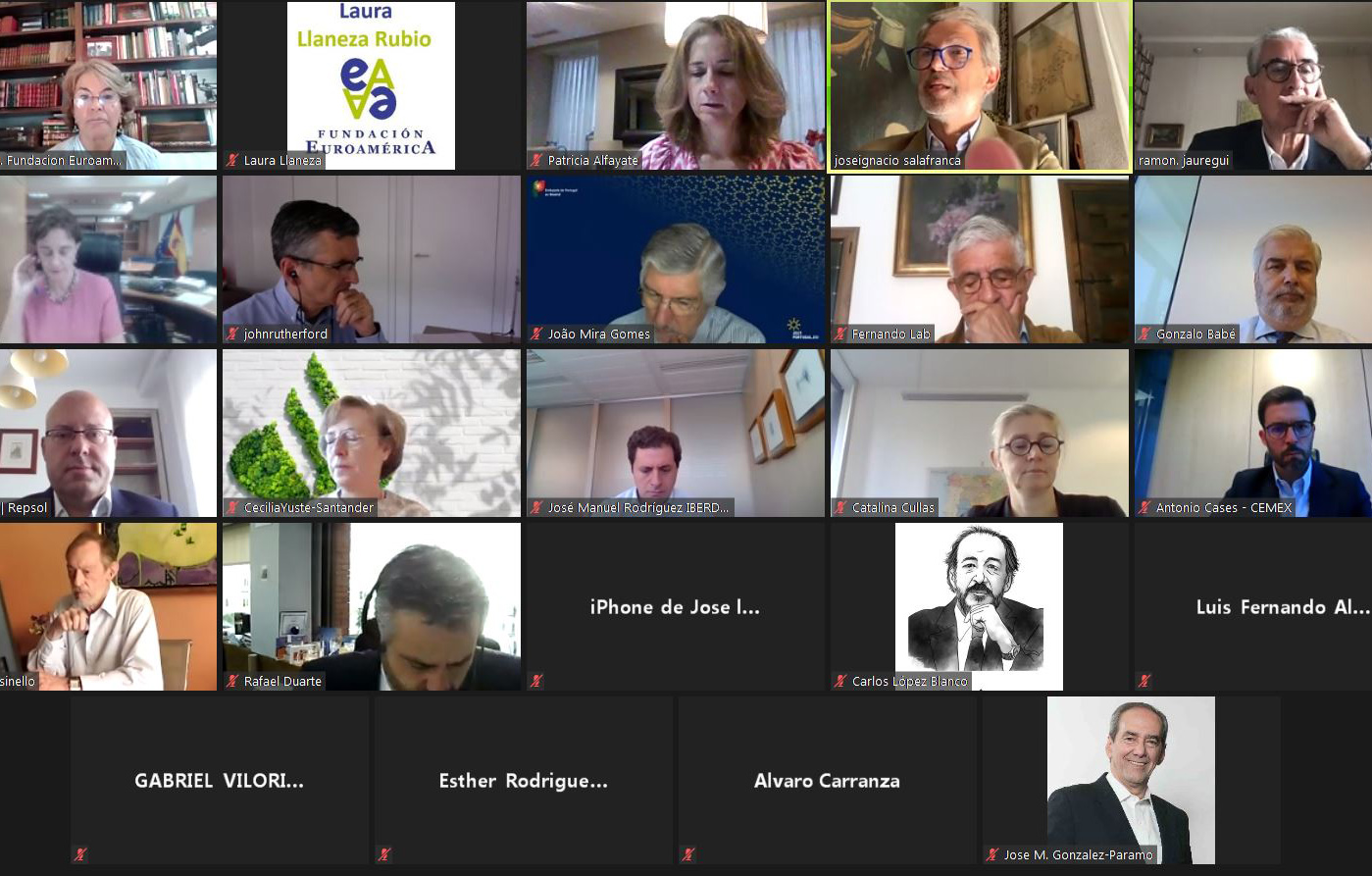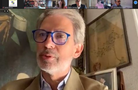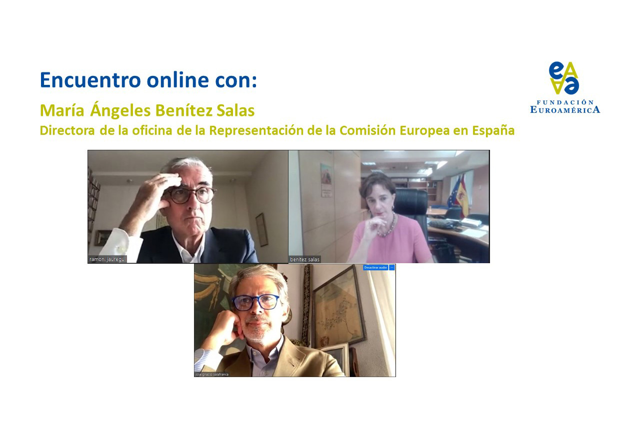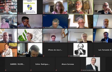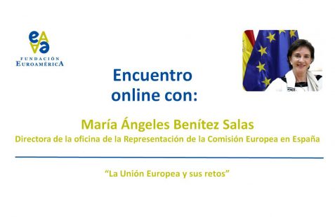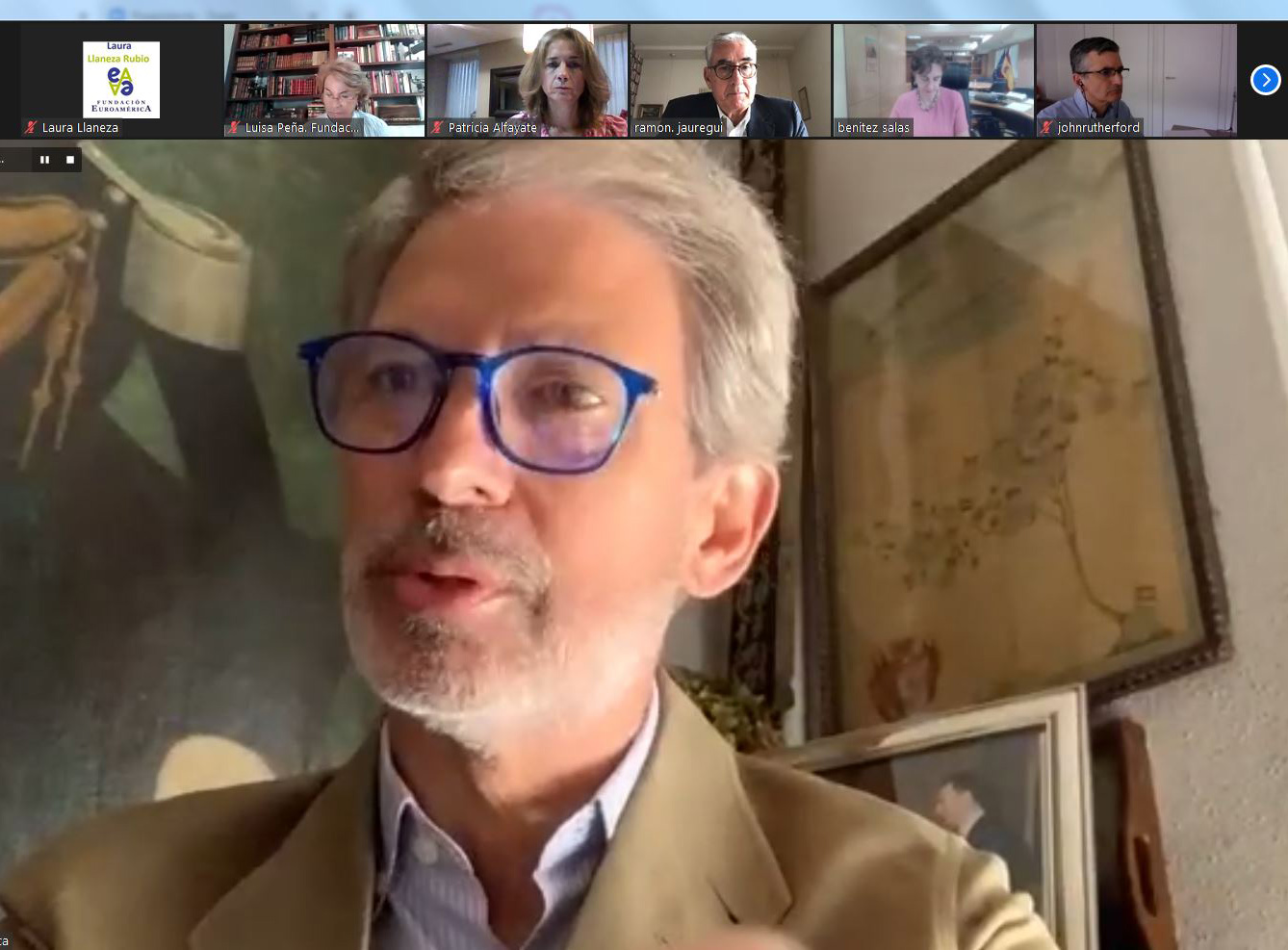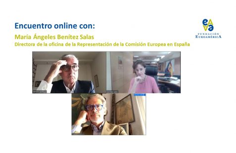 El vicepresidente Salafranca presenta a la invitada de honor Ángeles Benítez comentando que ha asumido su responsabilidad en pleno proceso de la conferencia sobre el futuro de Europa, cuando se está debatiendo también el plan de recuperación, y cuando la Unión Europea trata de afirmar su situación internacional a través de una nueva posición de autonomía estratégica. Recordando su estancia en Buenos Aires como Ministra Consejera –lo que hace que lleve los temas latinoamericanos en el corazón y que los conozca- le da la palabra.