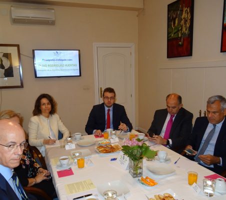 Continuó hablando del clima de estabilidad política y macroeconómica del país con un crecimiento promedio del 6,4% en los últimos tres años, destacando igualmente las vías de comunicación y de conectividad en el país, variables que convierten a su país en un buen destino de inversiones extranjeras. A Ello hay que sumar los incentivos fiscales y de protección a las inversiones, especialmente en algunos sectores como el turismo, la industria del cine, o las energías renovables, por citar solo algunos. El gran debate político que supone una deuda que equivale al 39% de su PIB fue otro de los datos que facilitó en Embajador Rodríguez Huertas para completar su primera intervención.