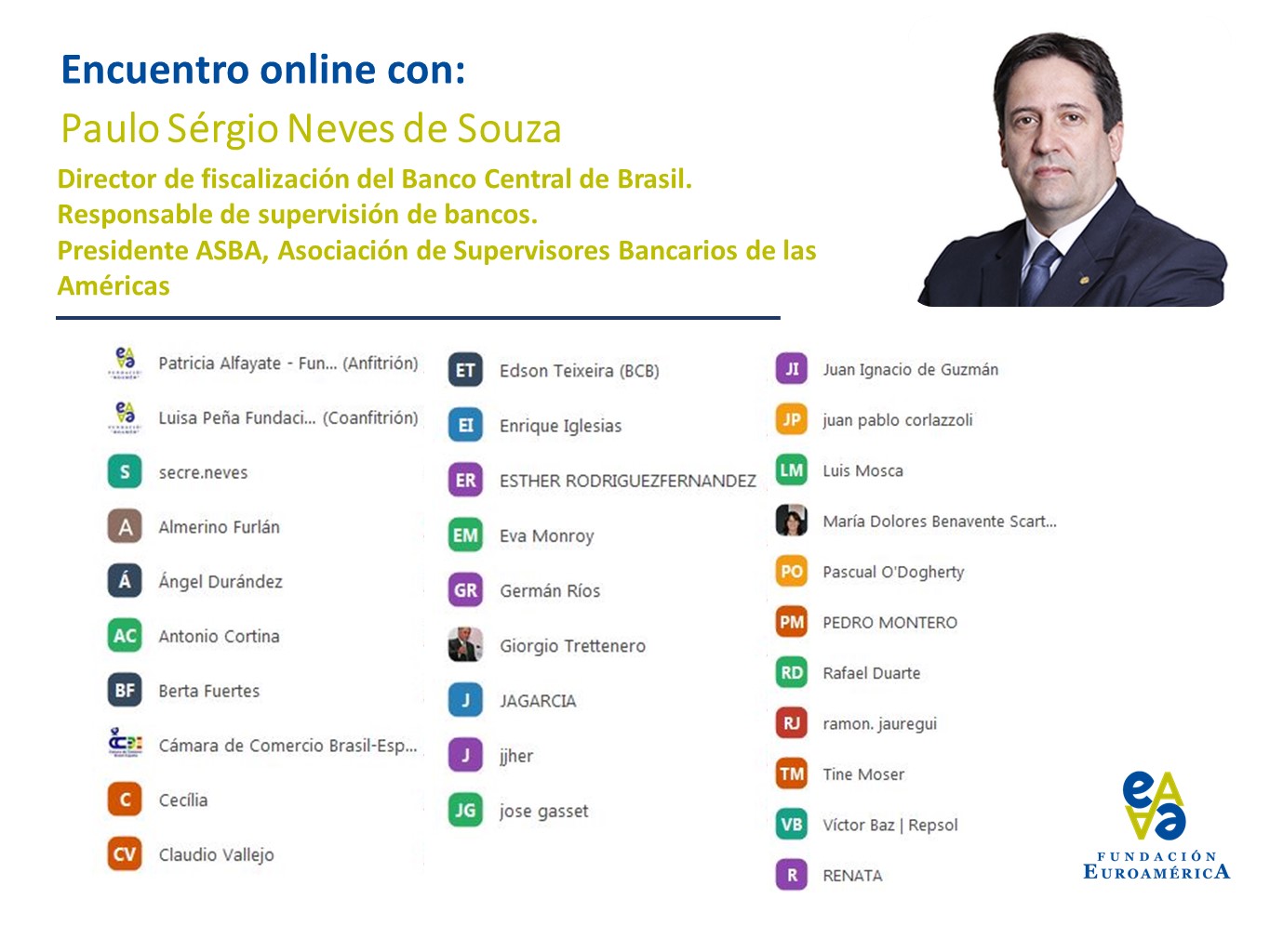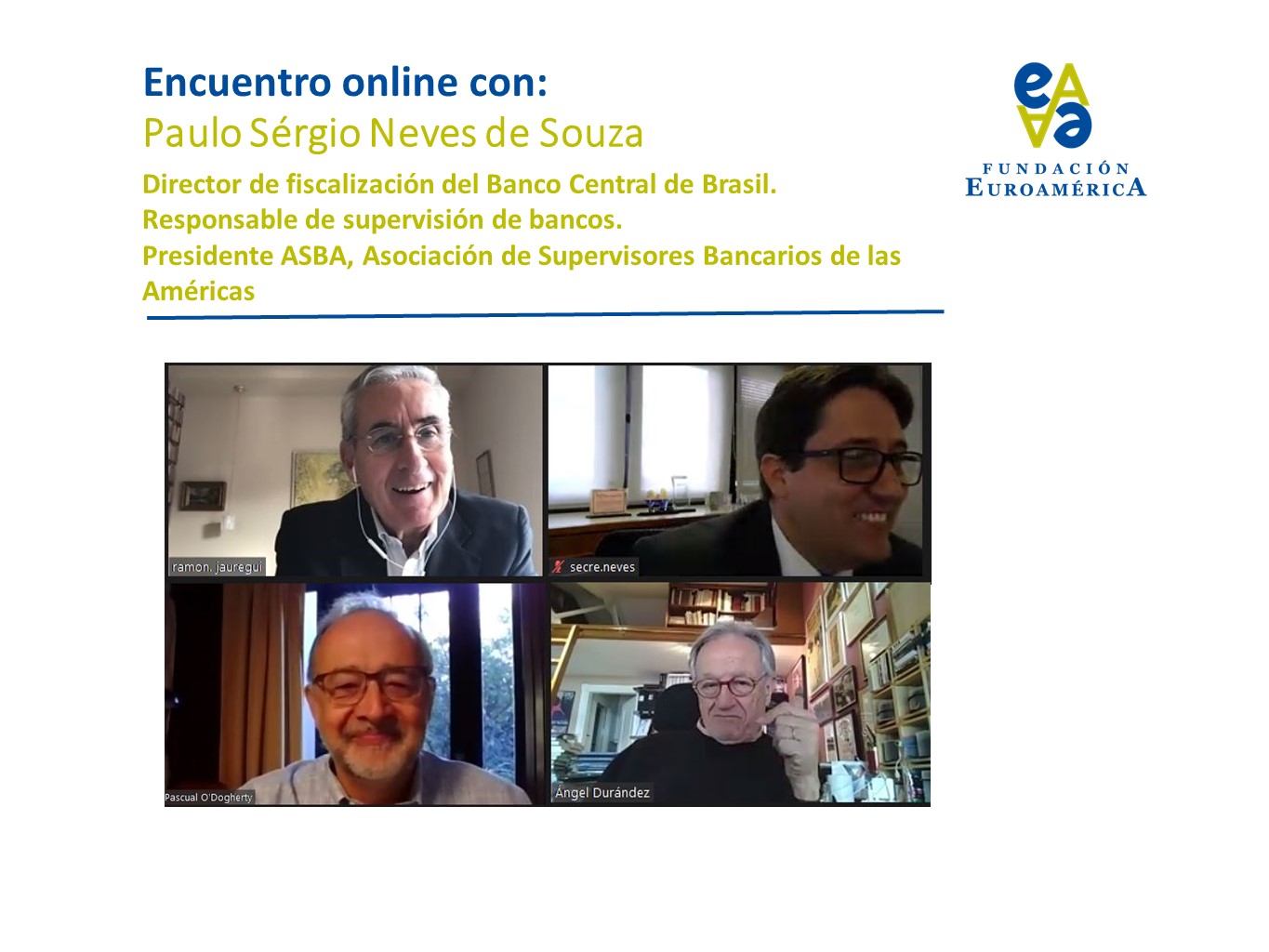 A continuación, José María Roldán, Presidente de la AEB, preguntó por el manejo de la incertidumbre estructural a la hora de calcular el daño en la economía y en los balances bancarios; la revolución digital, como oportunidad de negocio y de integración social y de la complicada rentabilidad estructural del sector bancario en un entorno de tipos bajos. El Economista Germán Ríos preguntó por la posibilidad de un nuevo ciclo de commodities, dado el aumento del precio de las materias primas en los últimos meses. El Secretario General de FELABAN, Giorgio Trettenero, comentó la posibilidad de flexibilizar la regulación hasta que estas olas pandémicas pasen; el apoyo a la banca; la posible crisis por crecimiento de endeudamiento de los países de la región y las criptomonedas. Durante el coloquio se tocaron otros temas como el impacto de la pandemia en las empresas de la economía formal brasileña -mucho menor de lo esperado, según apuntó el Sr. Neves- que incrementaron significativamente el uso de los canales digitales para hacer sus transacciones o las previsiones del Banco de Brasil para 2021 y 2022, entre otros.