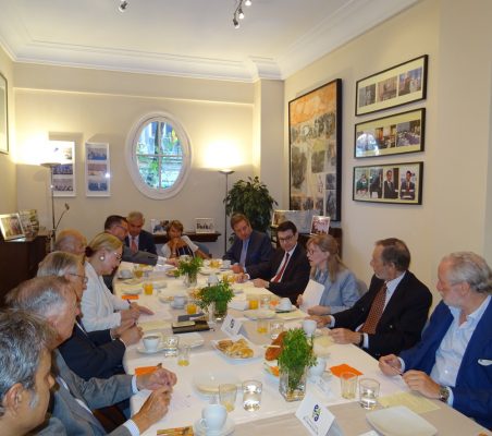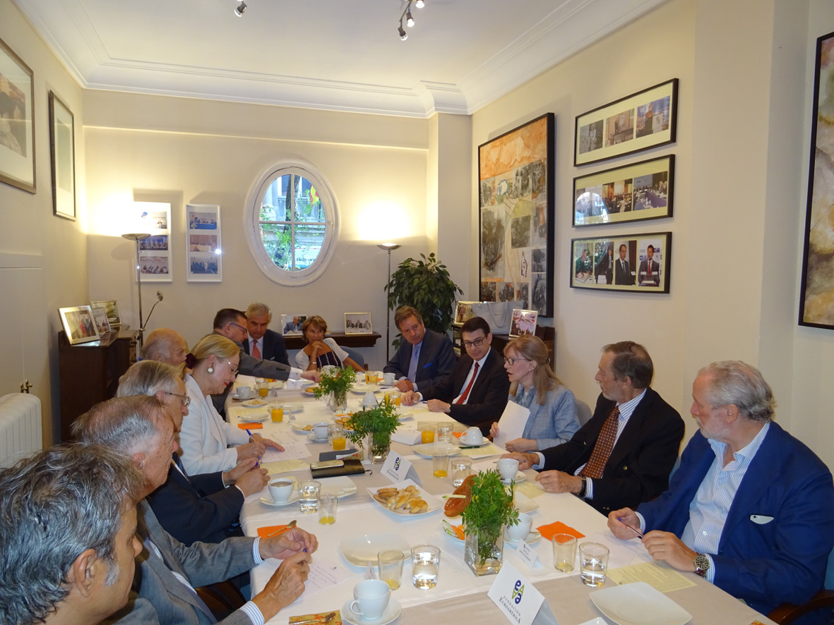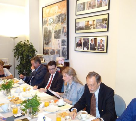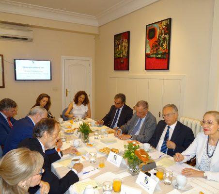 Como es habitual, tras la intervención del invitado de honor se entabló un interesante coloquio con los asistentes al desayuno, en el que se habló de diversos temas como la oportunidad única de la UE, por una parte de retomar un importante papel en el escenario global por sus valores y principios occidentales, y por otra de reforzar sus relaciones con América Latina precisamente como binomio occidental; el renovado impulso a la UE que puede significar el eje franco-germánico; la falta de un liderazgo sólido en la actualidad, tanto en el partido demócrata como en el republicano; las particularidades del sistema electoral estadounidense; la posibilidad de que prospere un impeachment al Presidente Trump o el papel de la prensa antes y después de las elecciones del 8 de noviembre del 2016, entre otros temas.