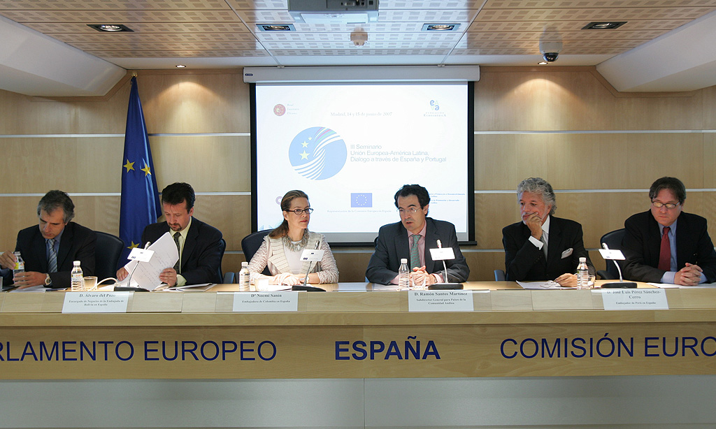 | Alfonso Díez Torres, Director General para las Relaciones Exteriores de la UE con Latinoamérica; Álvaro del Pozo, Encargado de Negocios de la Embajada de Bolivia en España; Noemí Sanín, Embajadora de Colombia en España; Ramón Santos Martínez, Subdirector General para Países de la Comunidad Andina, Dirección General de Política Exterior para Iberoamérica del Ministerio de Asuntos Exteriores y de Cooperación; José Luis Pérez Sánchez-Cerro, Embajador de Perú en España y Santiago Apunte Franco, Encargado de Negocios, Embajada de Ecuador en España |