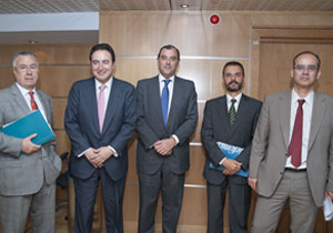 Salvador Arriola, Secretario para la Cooperación Iberoamericana, SEGIB, Javier López-Bartolomé, Presidente Américas&Iberia/ Wincor Nixdorf, José Antonio Silva e Sousa, Presidente de La Fundación Luso-Española, Juan Antonio Mielgo, Director de economía y estructura financiera de Telefónica, y Antonio Cortina, Director Adjunto del Servicio de estudios, Banco Santander |