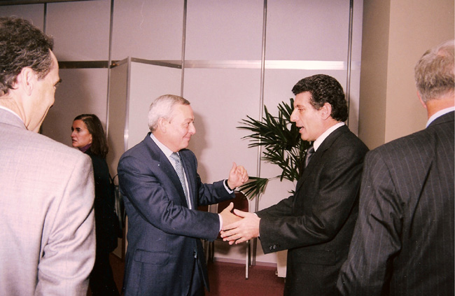 | Carlos Solchaga, ex Ministro de Economía y Hacienda de España, saludando a Carlos Álvarez, Vicepresidente de la Nación de Argentina |