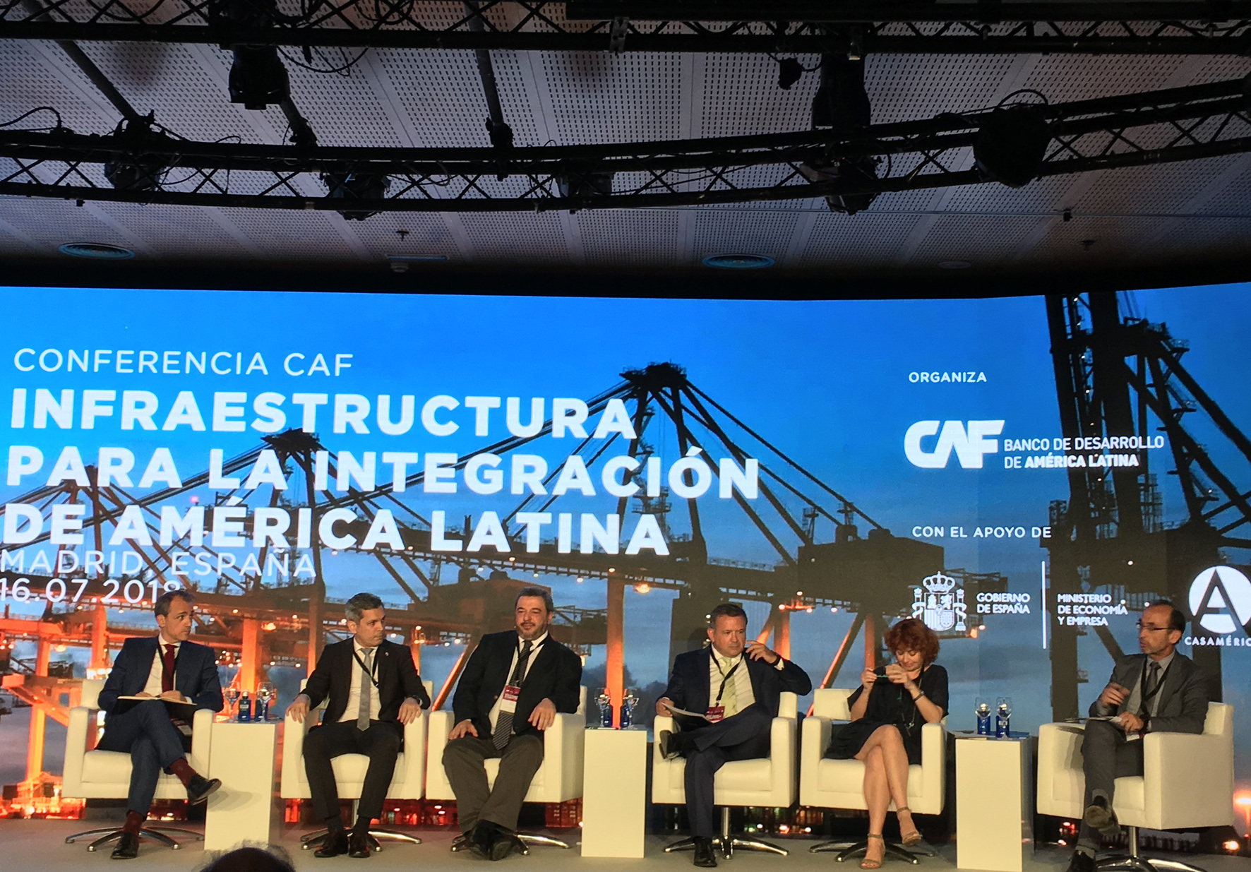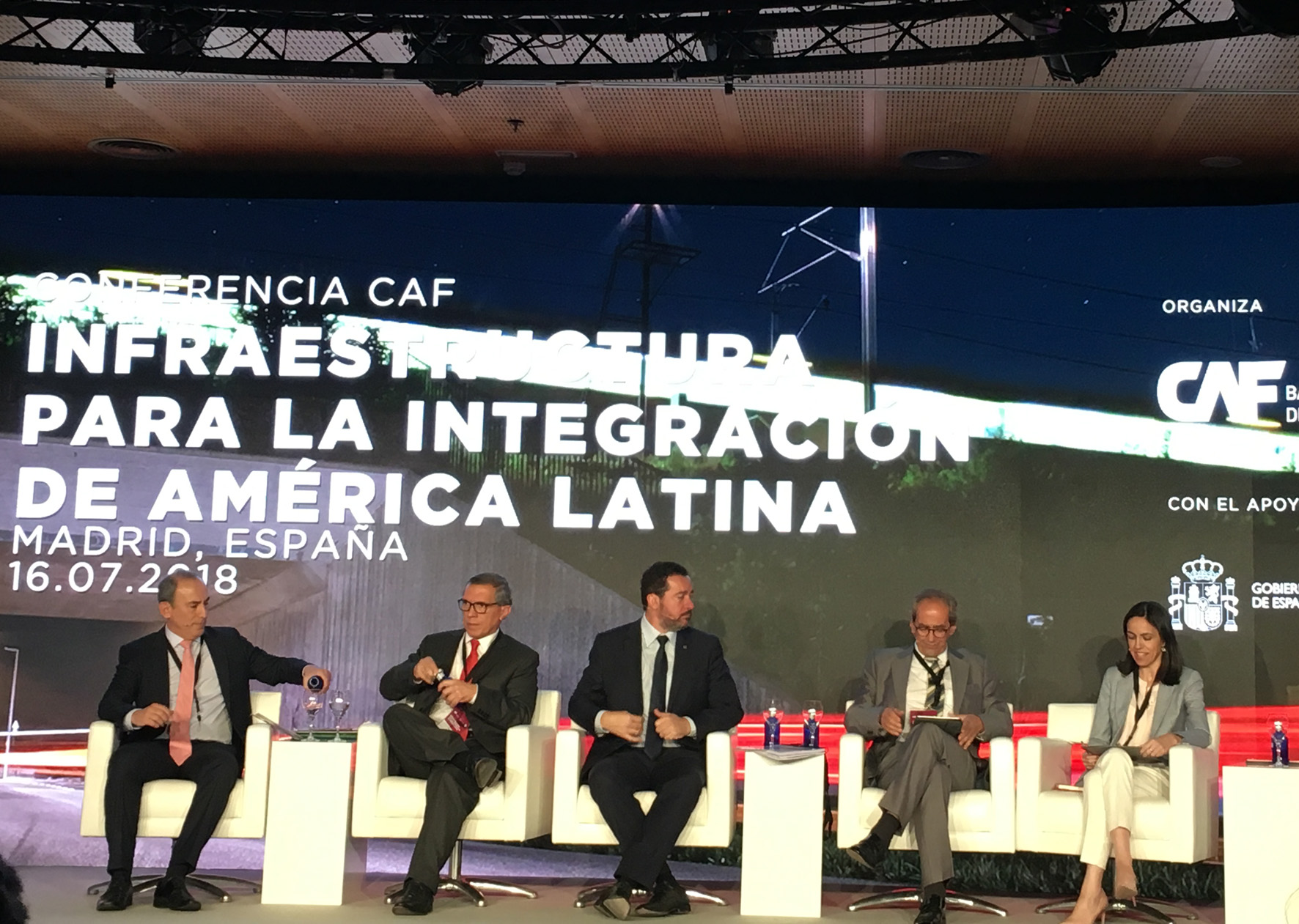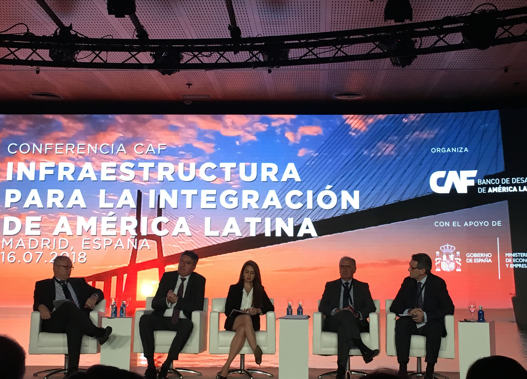 | 1ª sesión.– Antonio Pinheiro Silveira, Vicepresidente de Infraestructura de CAF; Mauricio Cárdenas, Ministro de Hacienda y Crédito Público, Colombia; Mariana Prado, Ministra de Planificación del Desarrollo, Bolivia; Juan Béjar, Presidente de Globalvía, y Vicente del Río, Chair of Corridors, Hubs and Synchromodality, Programa Europeo ALICE |