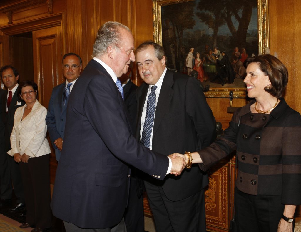 | S.M. el Rey Don Juan Carlos saluda a Leonor Ortíz Monasterio durante la Audiencia concedida a la Fundación Euroamérica, con motivo de su X Aniversario | ||