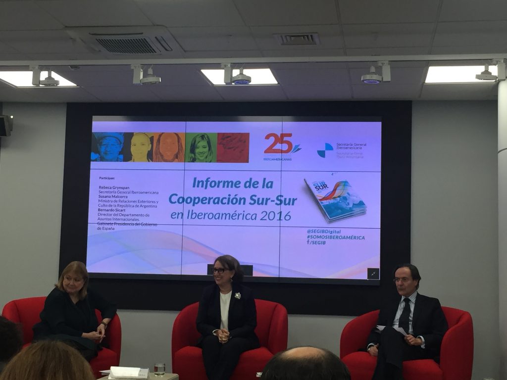Acto de presentación, en SEGIB, de la 9ª edición de su ‘Informe de la Cooperación Sur-Sur en Iberoamérica 2016’ que ha contado con la participación de la Secretaria General Iberoamericana, Rebeca Grynspan, y la ministra argentina de Exteriores, Susana Malcorra, cuyo país es líder regional en este tipo de cooperación.