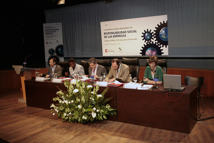 | Víctor Viñuales, Director de la Fundación Ecología y Desarrollo; Martin Kalungu Banda, ex Gerente regional para Social Performance de BP África y actual Asesor de Liderazgo Global en SIDA/IVH de Oxfam Reino Unido; Jaime Atienza, Responsable del Programa de RSE de la Fundación Carolina; Ken Caplan, Director del Building Partnerships for Development, e Isabel Roser, Responsable del Programa de RSE de la Fundación Carolina. |