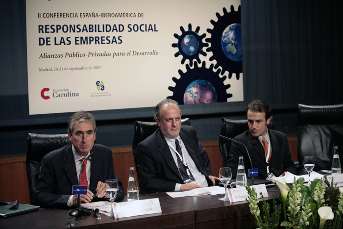 | Ramón Jáuregui, Portavoz del Grupo Parlamentario Socialista en la Comisión Constitucional; Ignacio Soleto, Director del Centro de Estudios para América Latina y la Cooperación Internacional (CeALCI) y Fernando Casado, Director de la Conferencia y Director del Centro de Alianzas para el Desarrollo. |