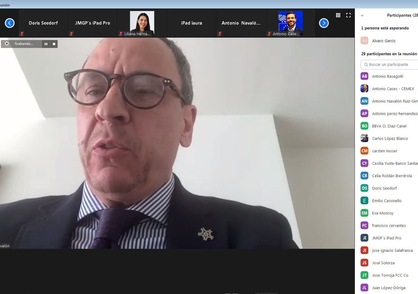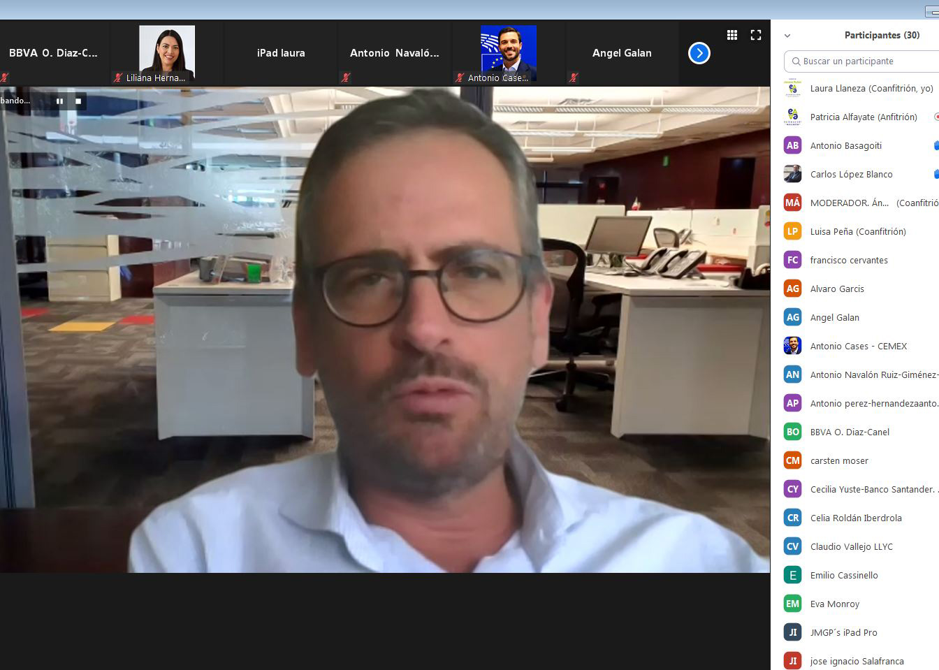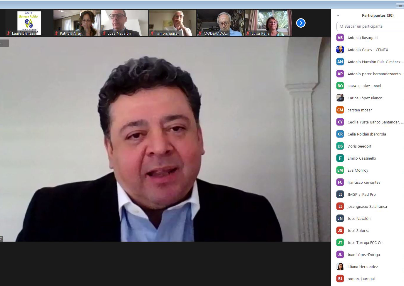 Finalmente, Raúl Félix Díaz pregunta que ya que en el acuerdo global modernizado se abre la posibilidad de participar en licitaciones públicas, cuáles cree que serán los sectores de oportunidad que abre este acuerdo? El Sr. Cervantes habla del sector energético -como el fotovoltaico- en el que se llegarán a acuerdos, pero sobre todo destaca el sector de la construcción que es el que más ramas industriales incluye más otras de servicios y por ello pueden reactivar más rápidamente la economía. Y el presidente está de acuerdo en la apuesta por la infraestructura. Cita también el sector automotriz por sus cadenas de valor. Se está trabajando con la Banca de desarrollo para buscar líneas de financiación (mediante la obtención de garantías), pero se hace desde el sector privados y enfocado a la media empresa ya que el gobierno está apoyando a la micro y pequeña industria. Las empresas grandes serán a través de la Banca comercial. Hay fondos interesados en invertir en México y se están fijando en el sector agroalimentario, sector que la pandemia ha demostrado que es fundamental.
