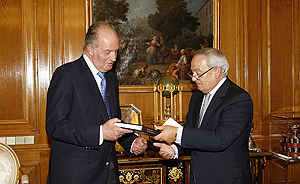 | S.M. el Rey recibe el libro “Una década para conocernos más”, editado por la Fundación Euroamérica, de manos del su Presidente, Carlos Solchaga. |