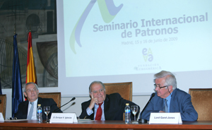 | Enrique V. Iglesias, Secretario General Iberoamericano, en la apertura del Seminario Internacional de Patronos, junto al primer Presidente de la Fundación, Tristan Garel-Jones y el actual Presidente, Carlos Solchaga |